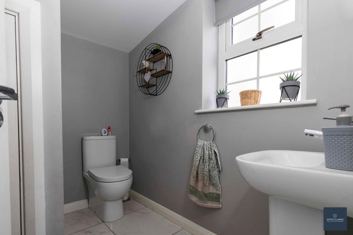 Back to wall dual flush WC. Pedestal style sink with mixer tap. Tiled floor and part tiled walls. Window. Extractor. Storage unit.