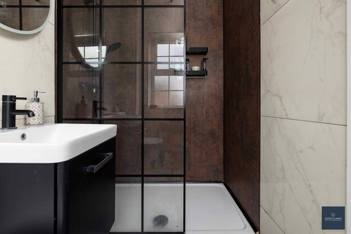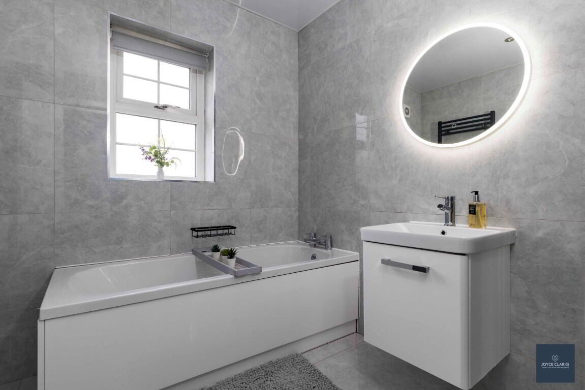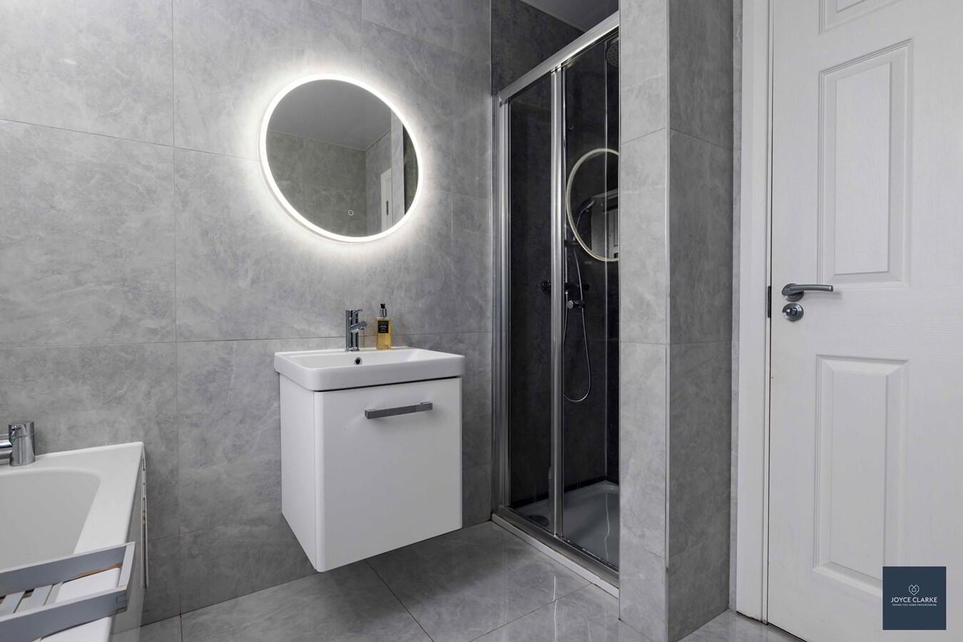 Fully tiled modern four piece suite comprising of moulded bath with mixer taps. Shower cubicle with dual waterfall shower head attachments. Floating sink with mixer tap and vanity unit below. Back to wall dual flush WC. Heated towel rail.