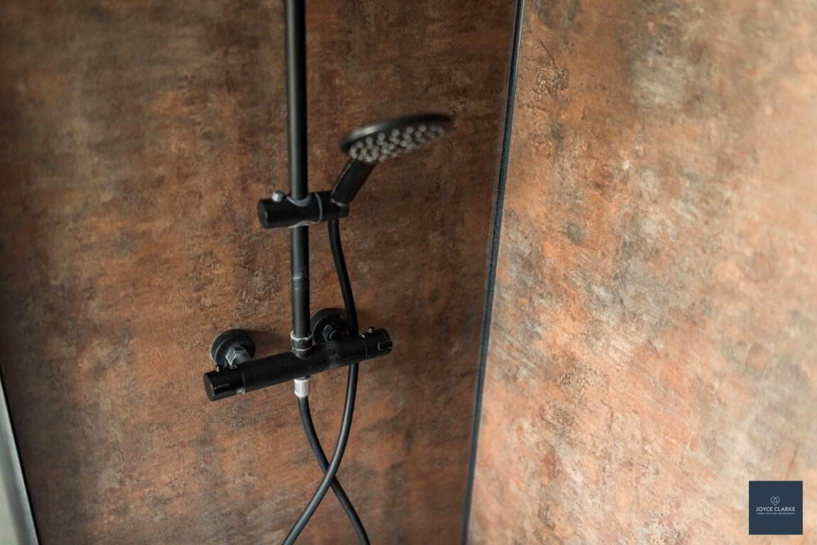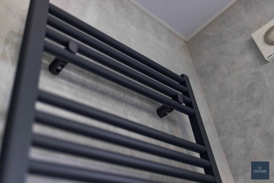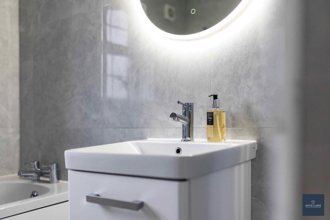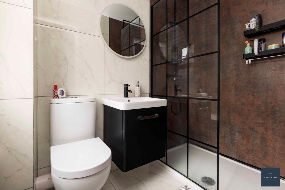 Fully tiled modern four piece suite comprising of moulded bath with mixer taps. Shower cubicle with dual waterfall shower head attachments. Floating sink with mixer tap and vanity unit below. Back to wall dual flush WC. Heated towel rail.