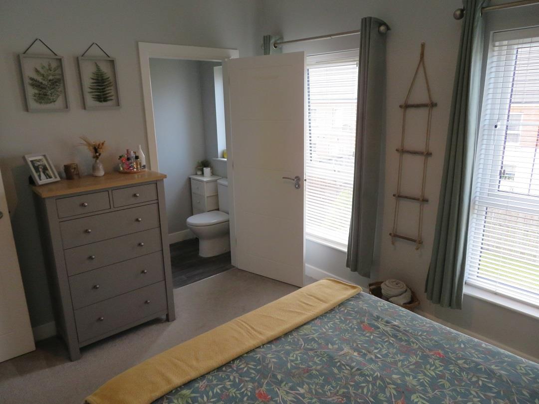 Rear aspect master bedroom with carpet flooring and ensuite shower.