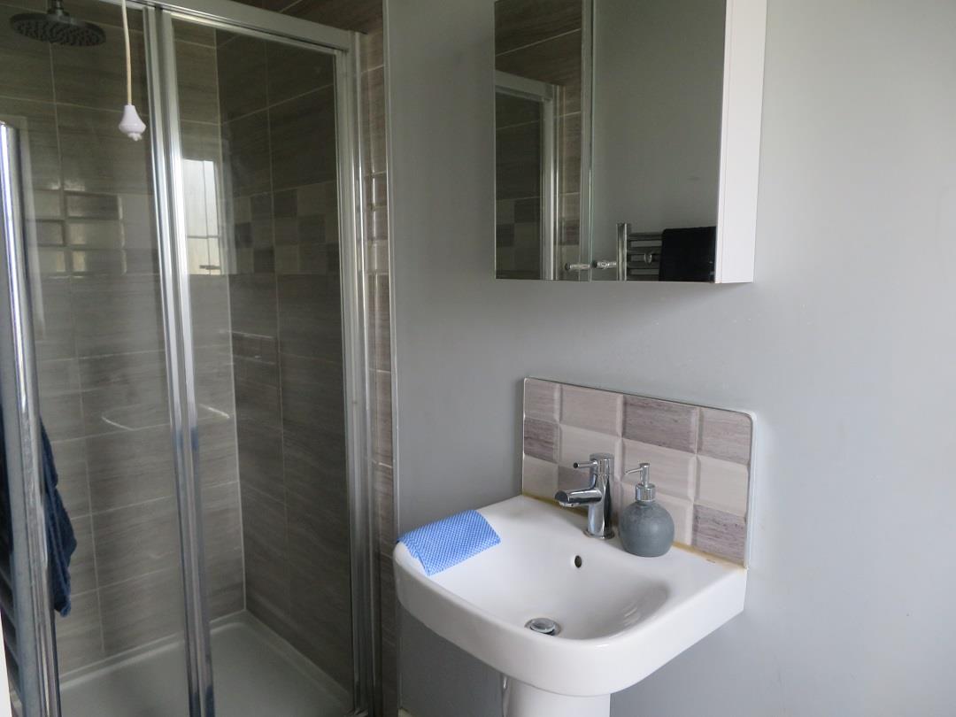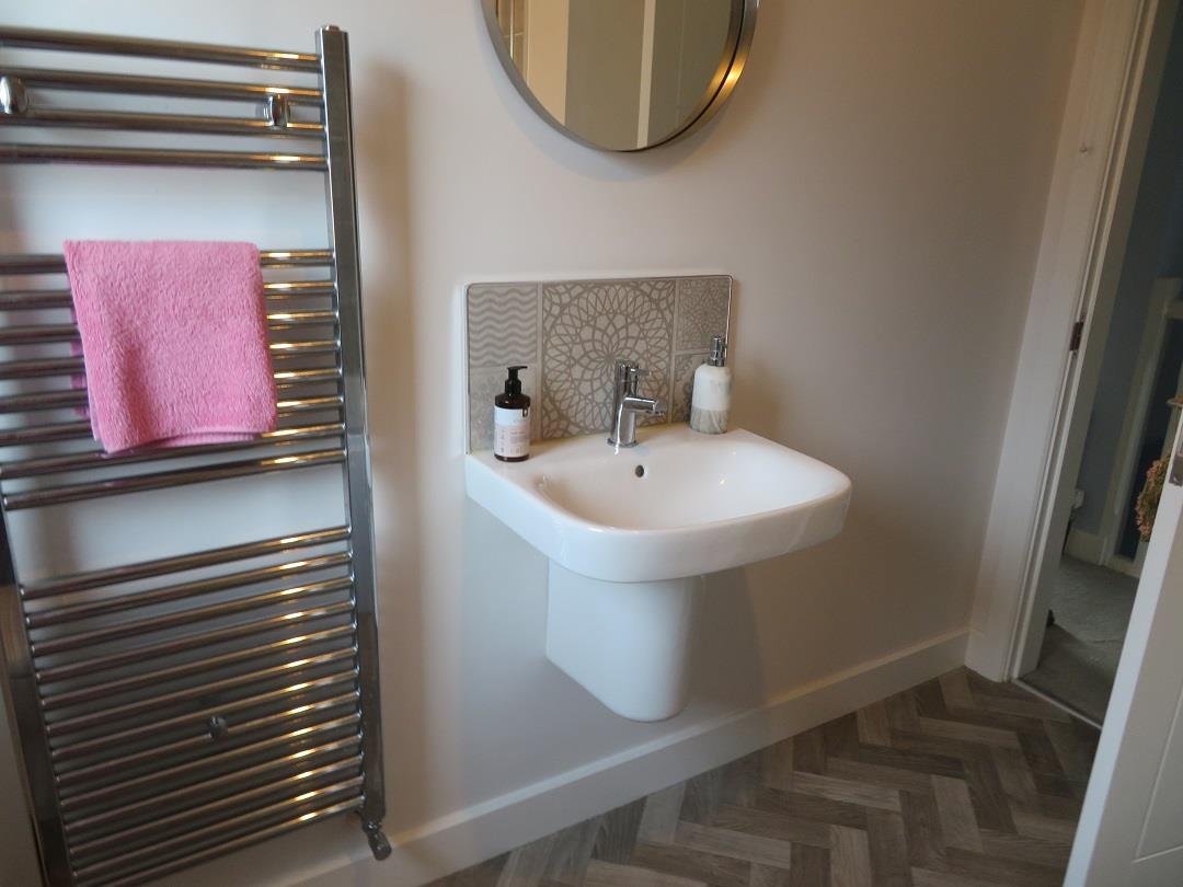 Mains powered shower with drencher head, pedestal wash hand basin and WC, heated towel rail, vinyl flooring and partially tiled walls.