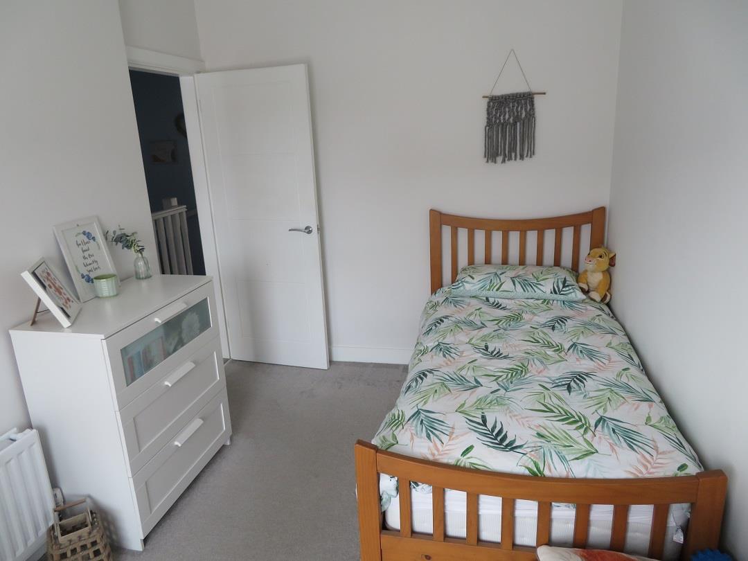 9´1 x 6´11 Front aspect single bedroom with built in storage over stairs and carpet flooring.