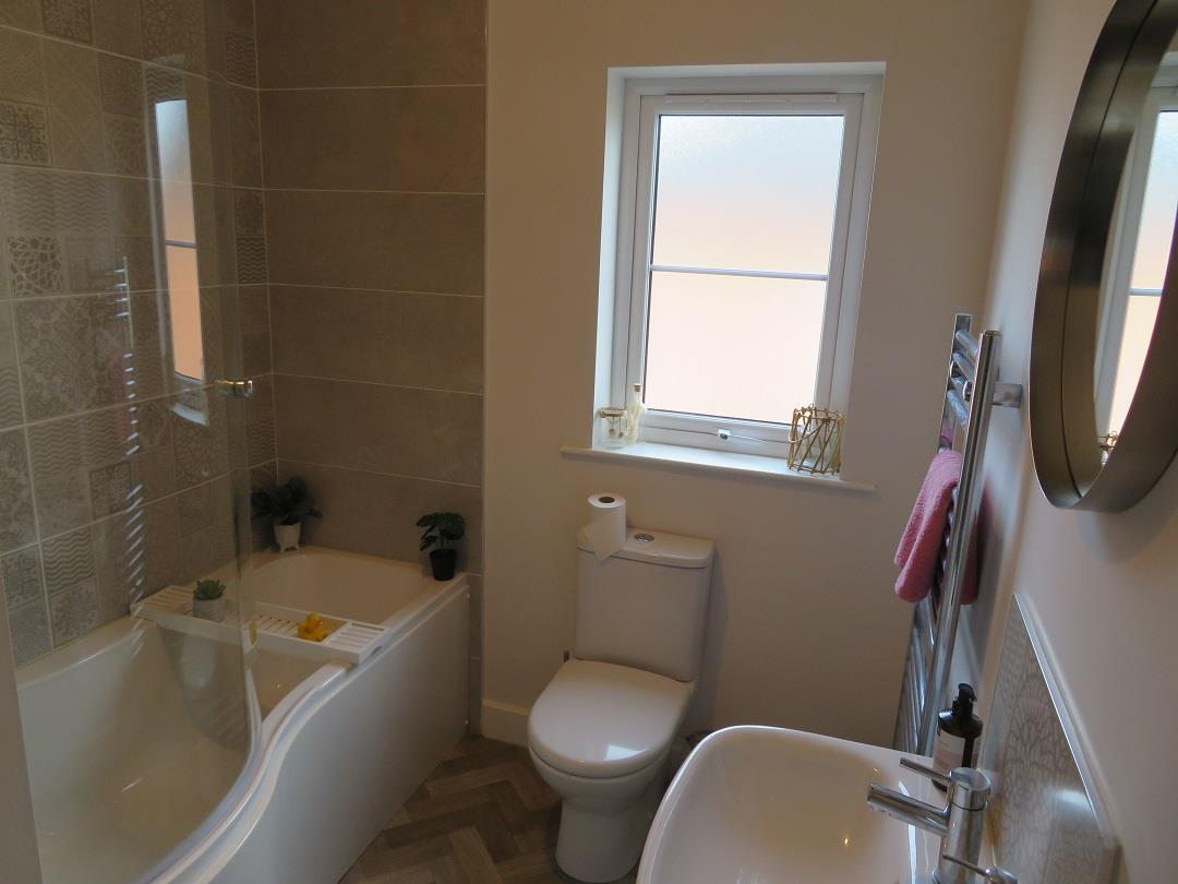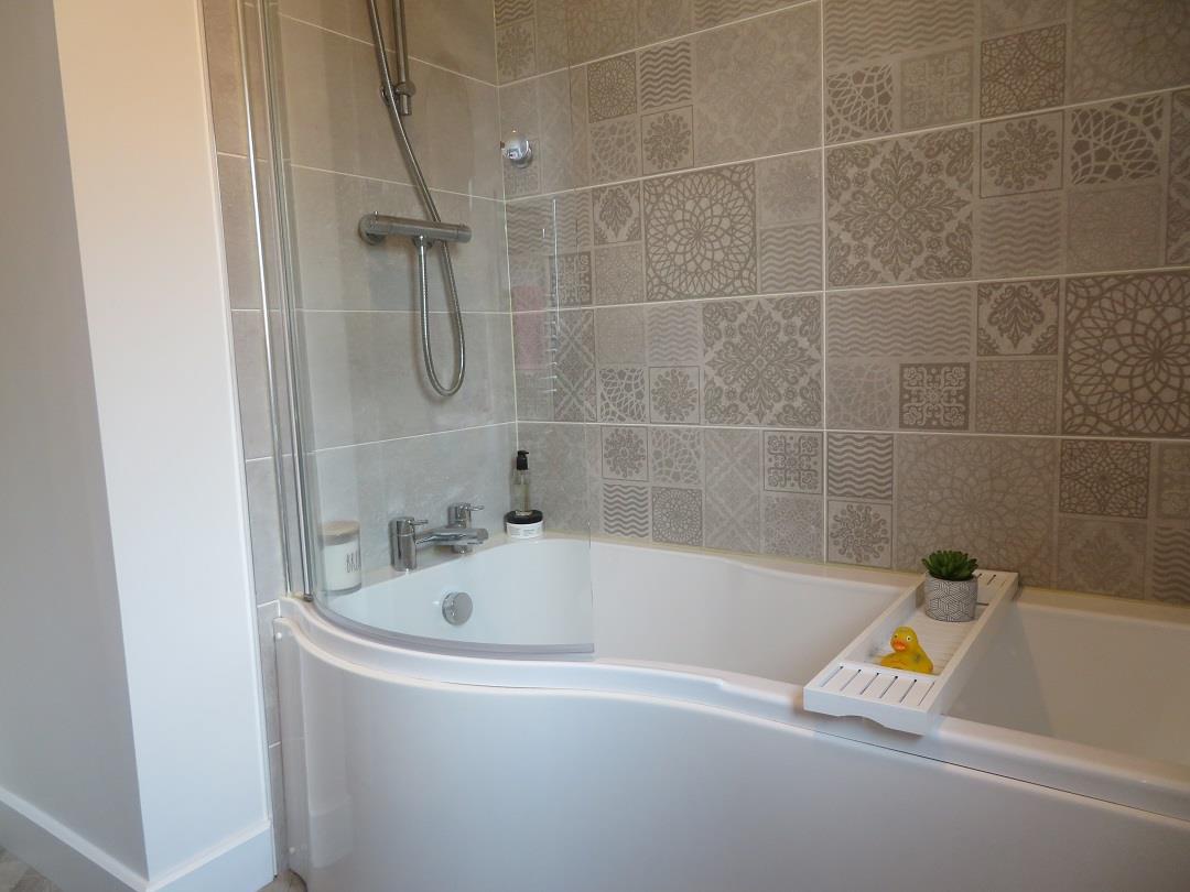 White bathroom suite comprising panel bath with shower above, wall hung was hand basin and WC, heated towel rail, partially tiled walls and vinyl flooring.