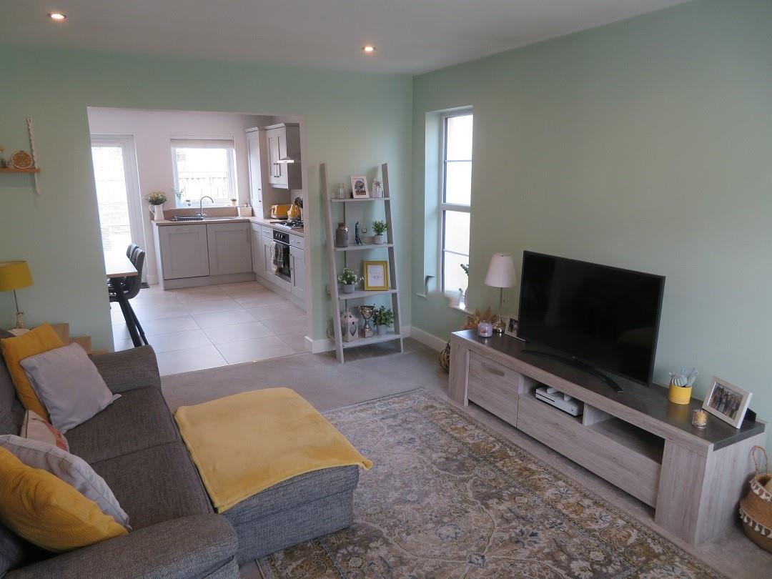 Bright living room with carpet flooring and recessed lights, open plan through to kitchen.
