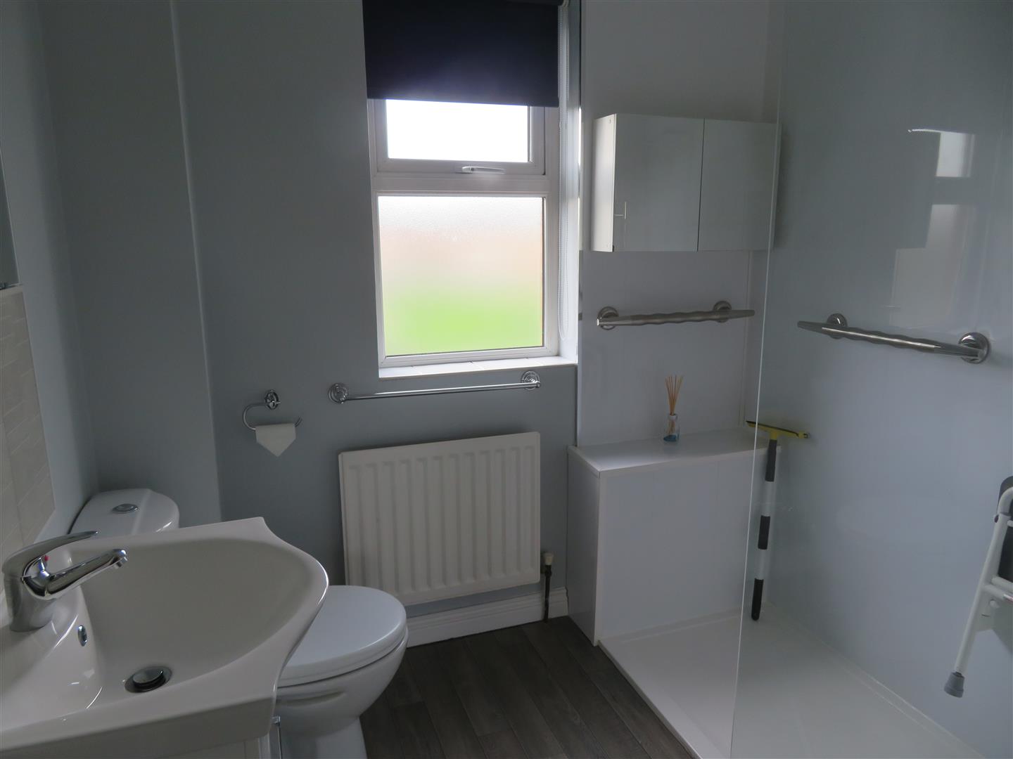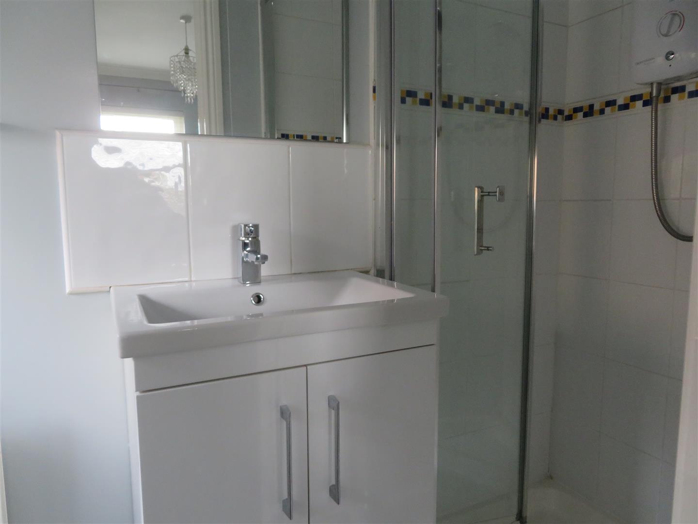 Shower enclosure with electric shower, WC, wash hand basin with vanity unit. Vinyl flooring.