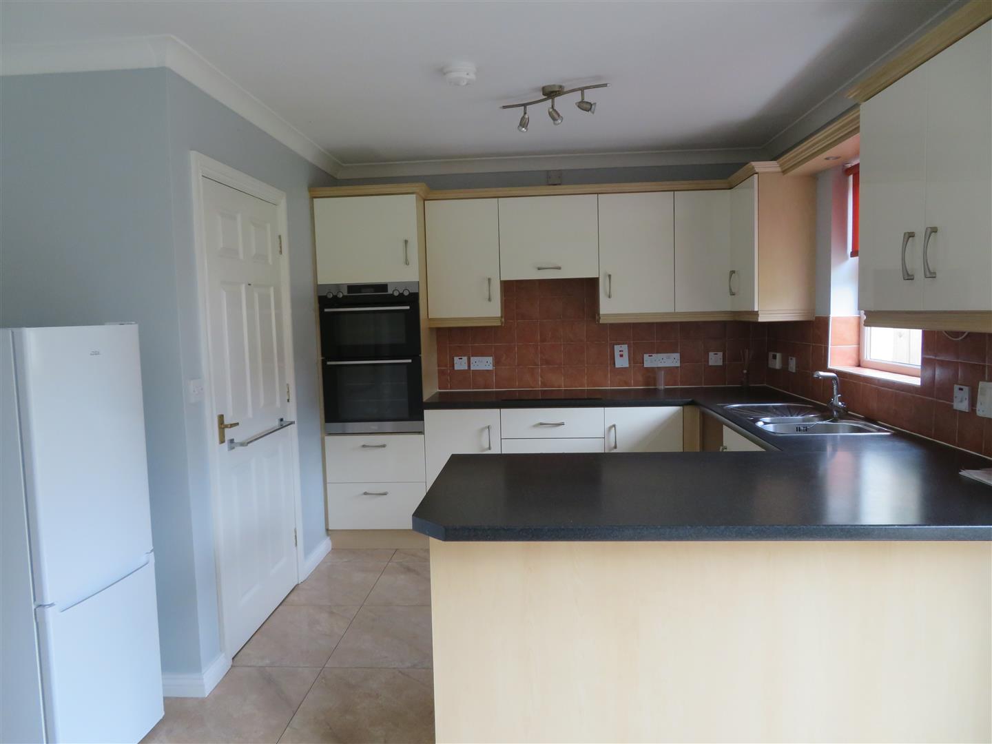 A range of high and low level units with double built in oven and hob with extractor above. Plumbed spaces for washing machine and dishwasher. 1 ½ stainless steel sink with mixer tap, pelmet with lights above. Partially tiled walls and fully tiled floor. Patio doors to rear garden.