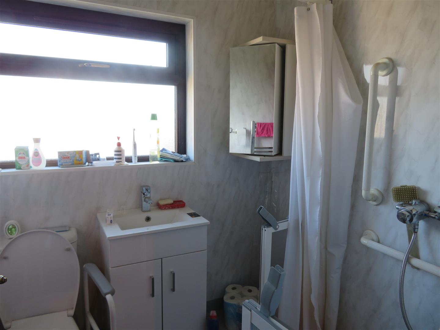 Disabled access shower, wash hand basin with vanity unit and WC. PVC paneling and non-slip flooring.