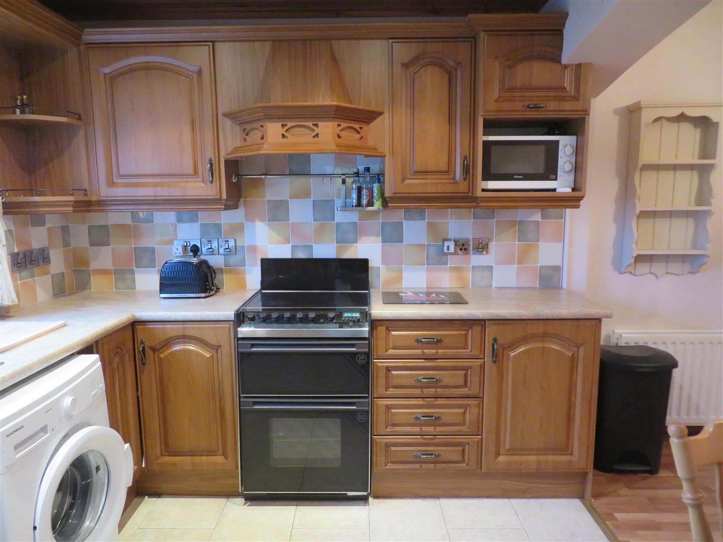 A good range of high and low level units including display cabinet. Space for cooker, fridge/freezer, washing machine and dishwasher. Breakfast bar, tongue & groove ceiling with down lighters in kitchen area. Partially tiled walls, tiled and laminate flooring. PVC door to rear.