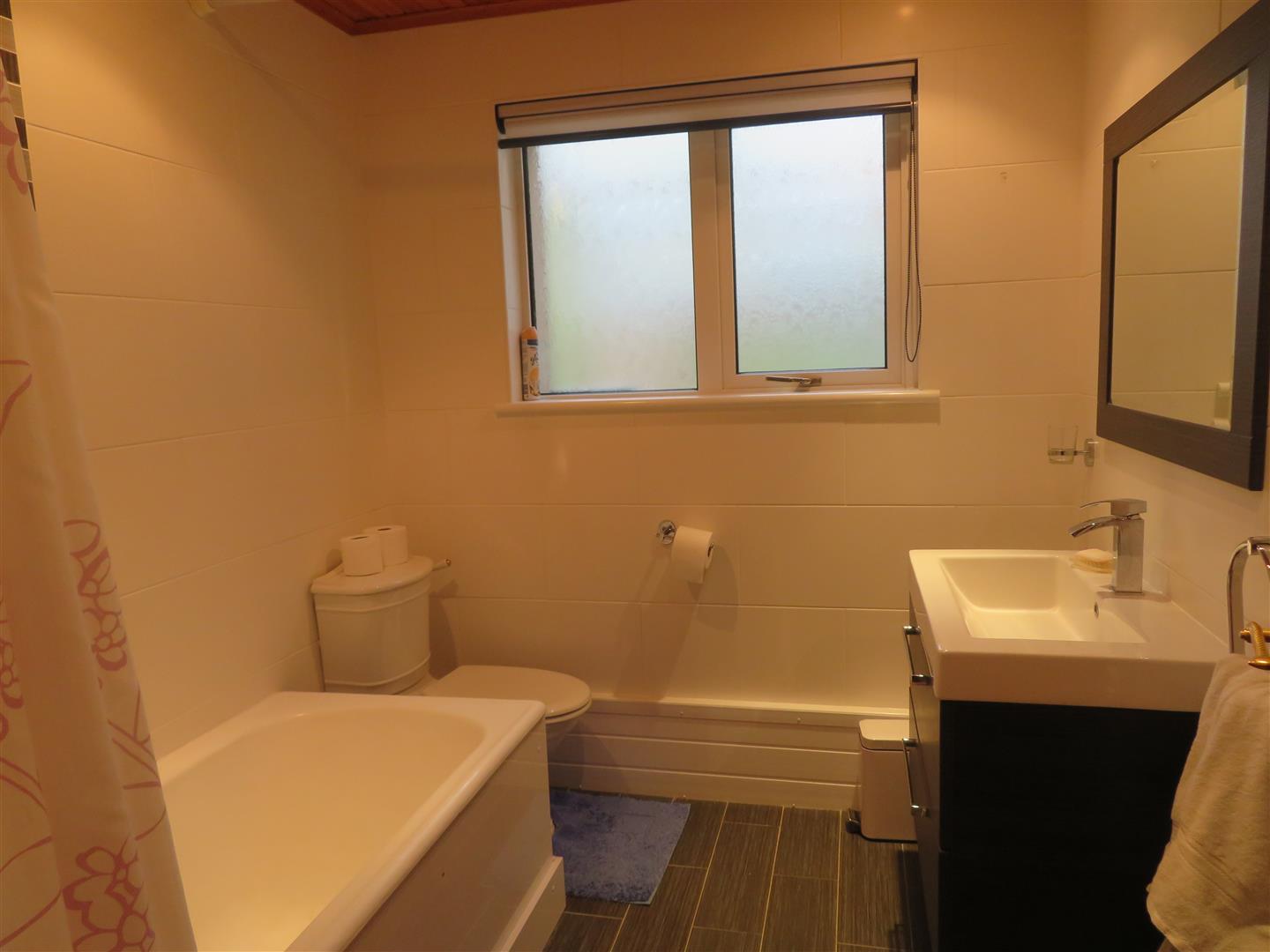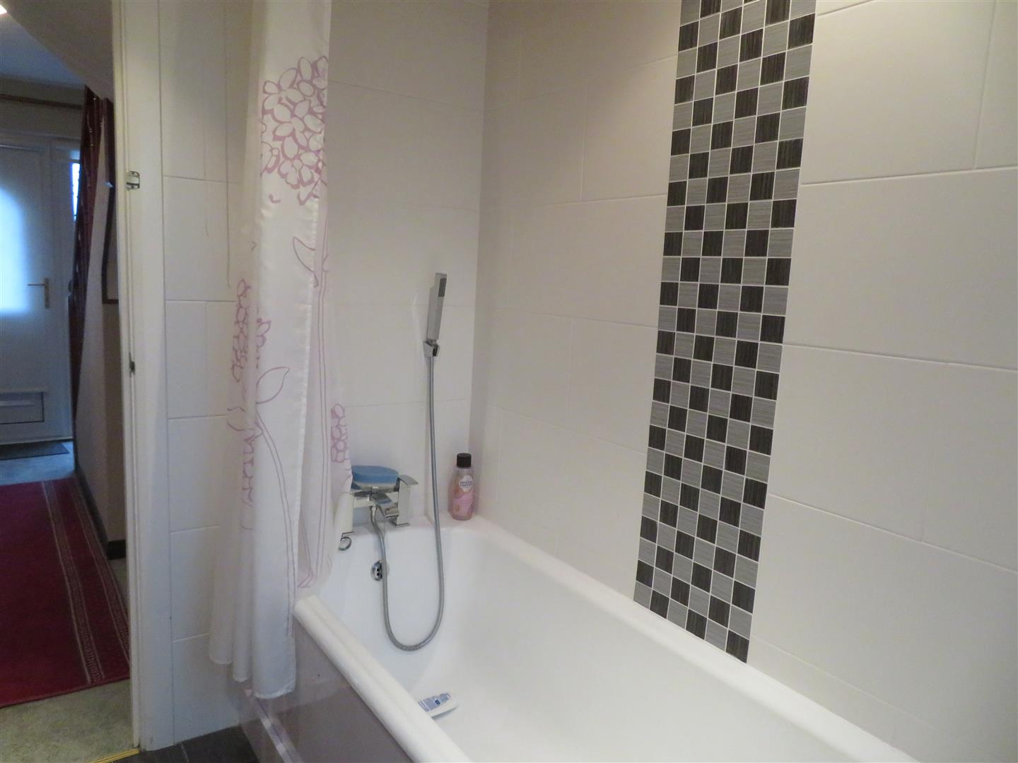 Panel bath, WC and wall hung wash hand basin with vanity. Fully tiled walls and floor.