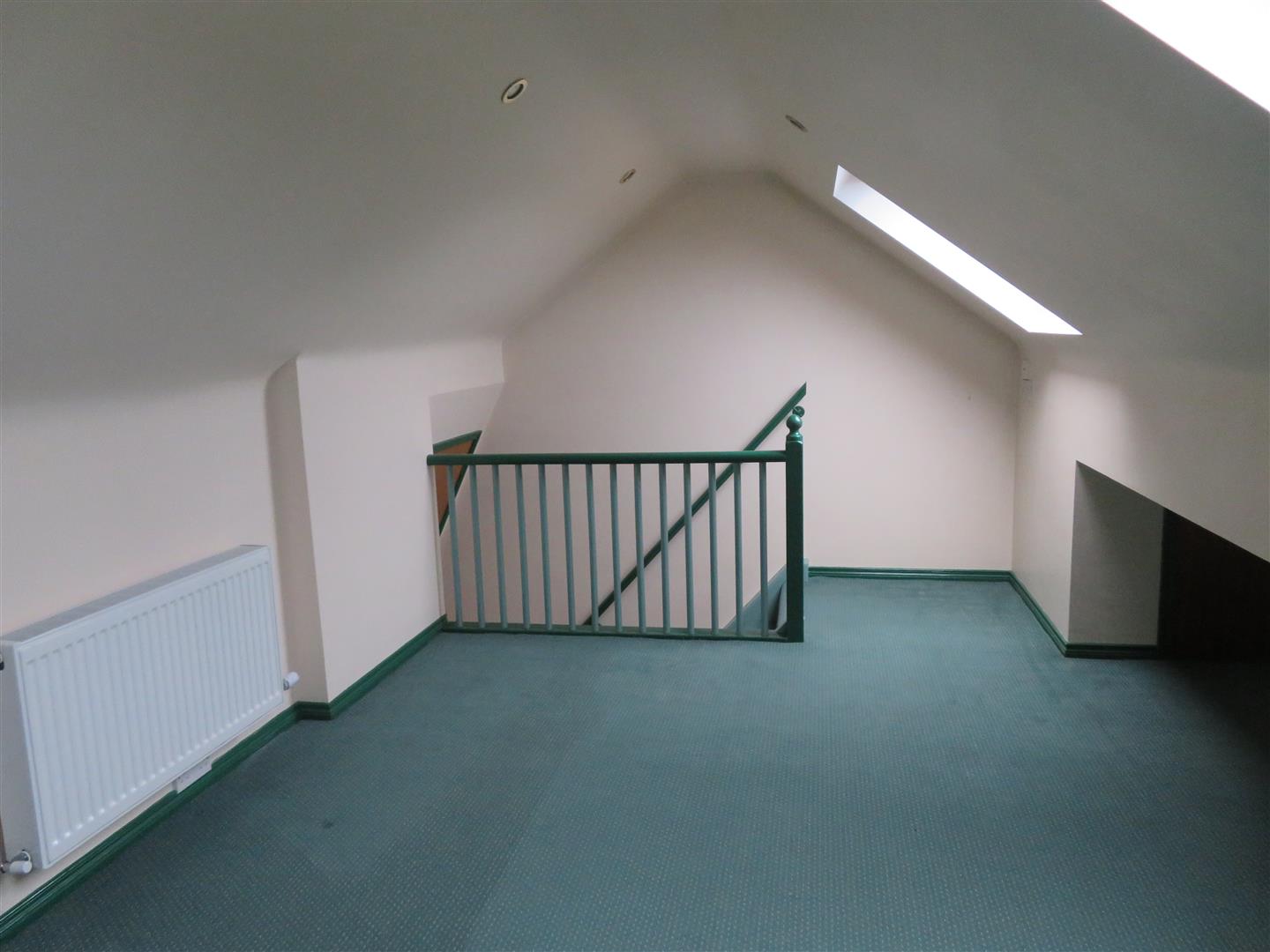 Skylight windows, under eaves storage, electrical sockets and carpet flooring.