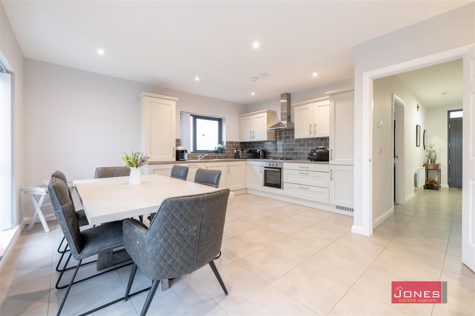 Spacious kitchen diner, good range of high and low fitted units, built in oven and gas hob with stainless steel extractor hood above, integrated fridge freezer, dishwasher and washing machine, tiled flooring, partially tiled walls, recessed lights and double patio doors to rear.