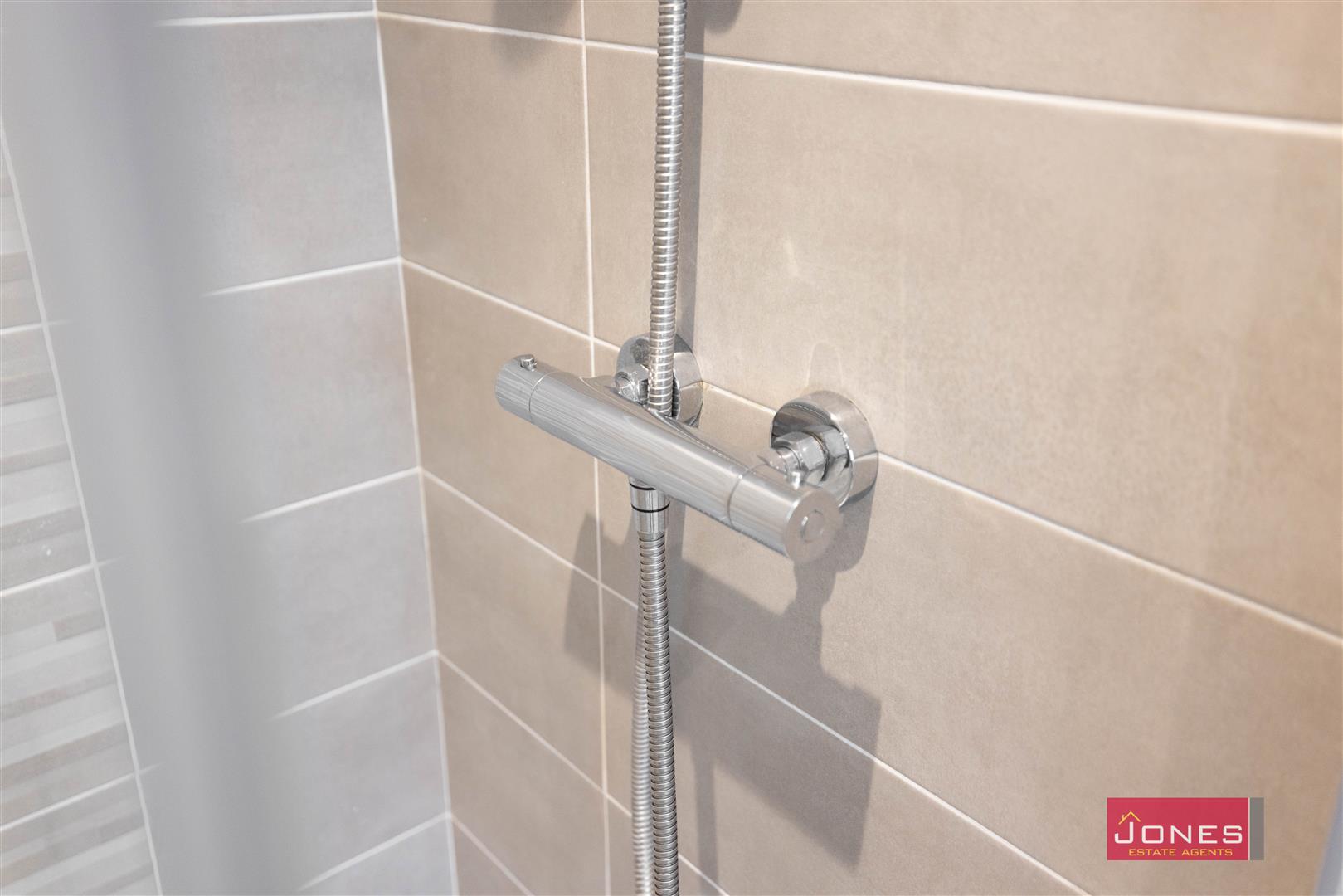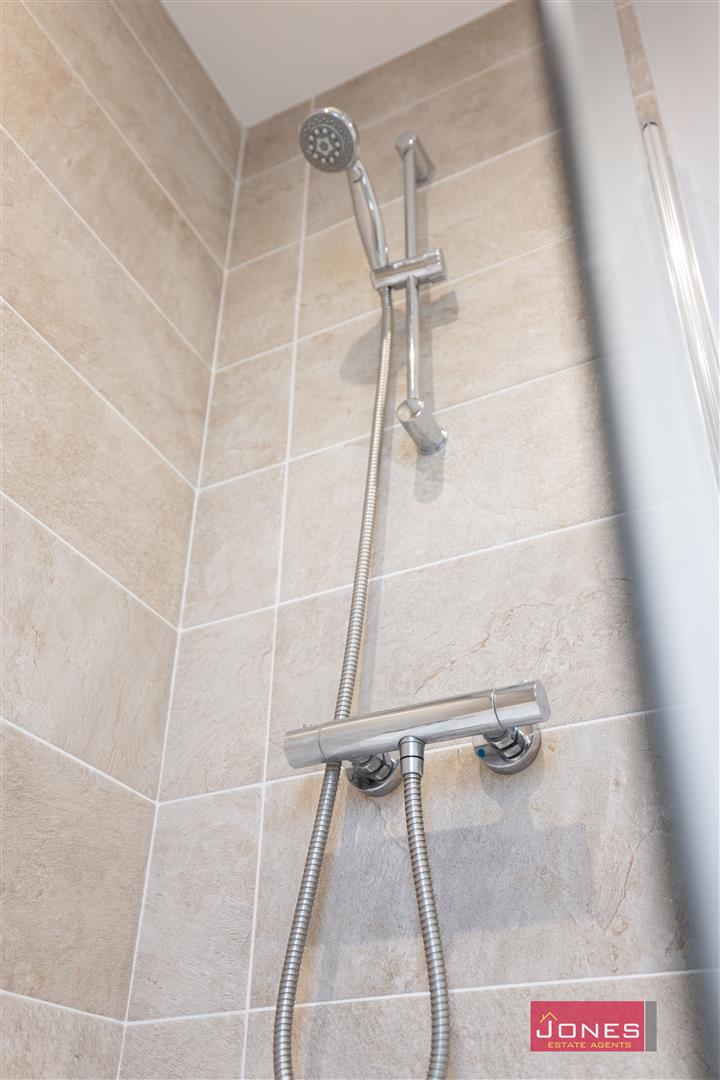 Mains powered shower, dual flush WC and wash hand basin, tiled floor, partially tied walls.
