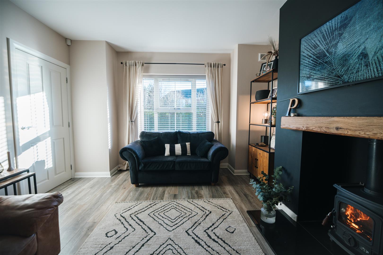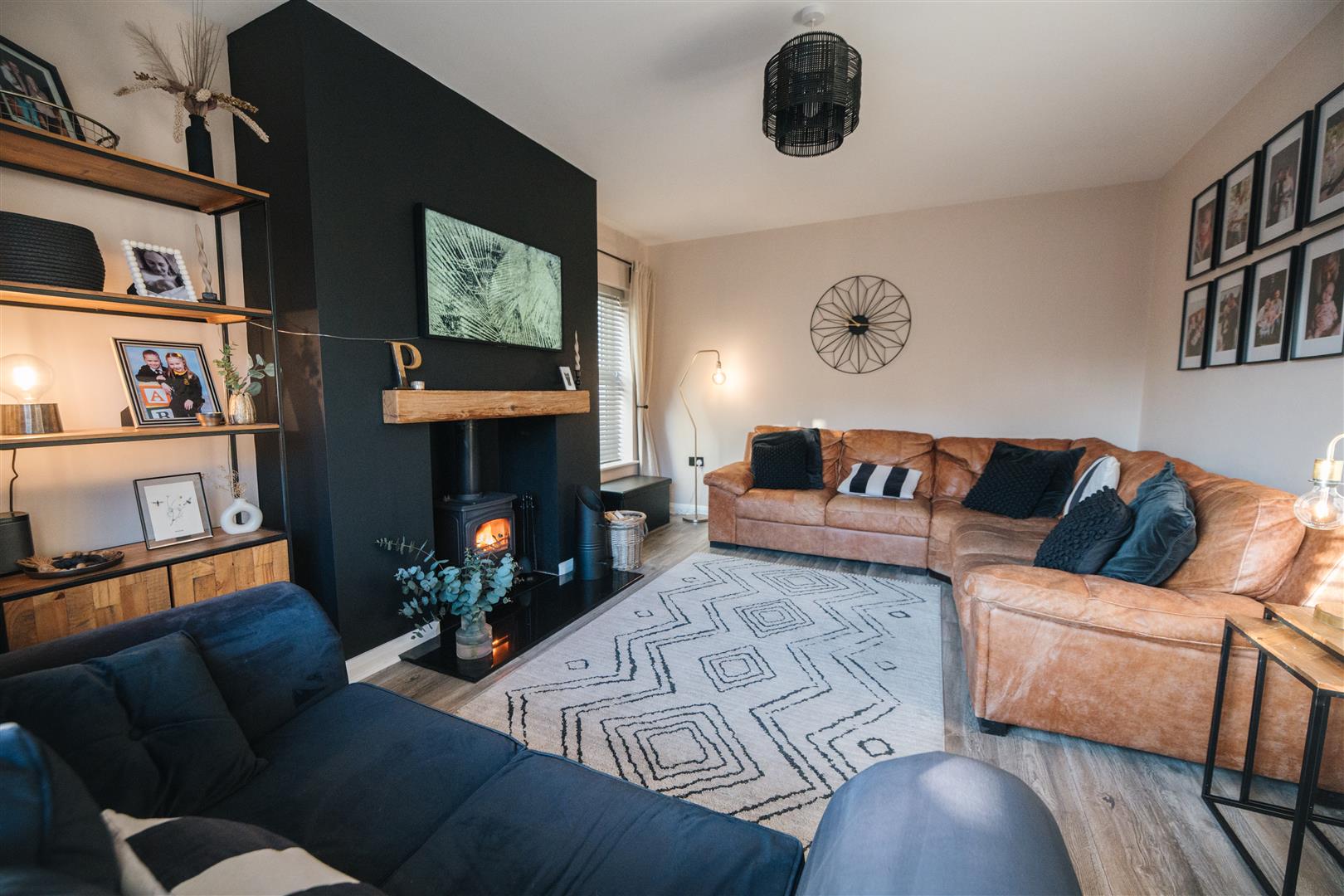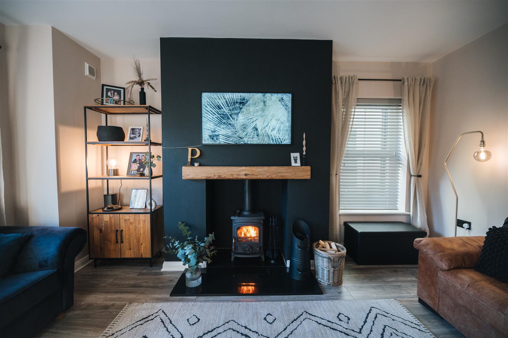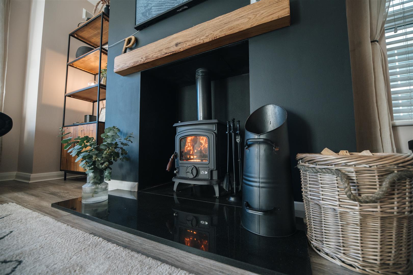 The warm and inviting living room features a statement stove, creating a welcoming space for both relaxation and entertaining.