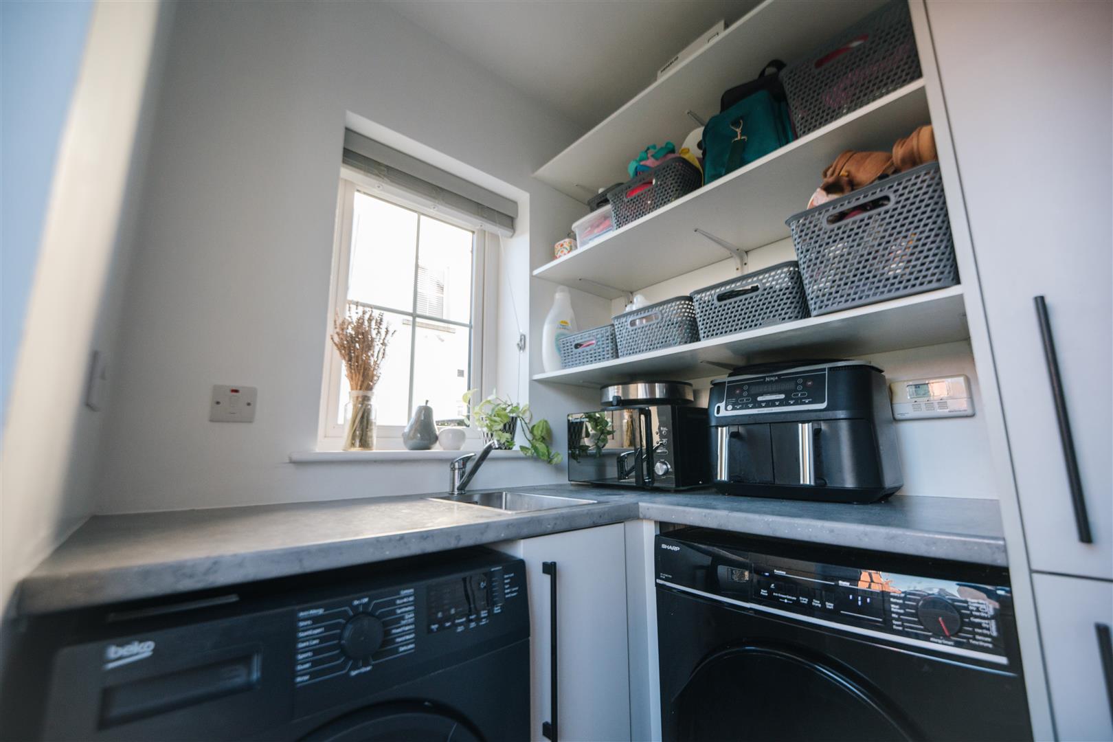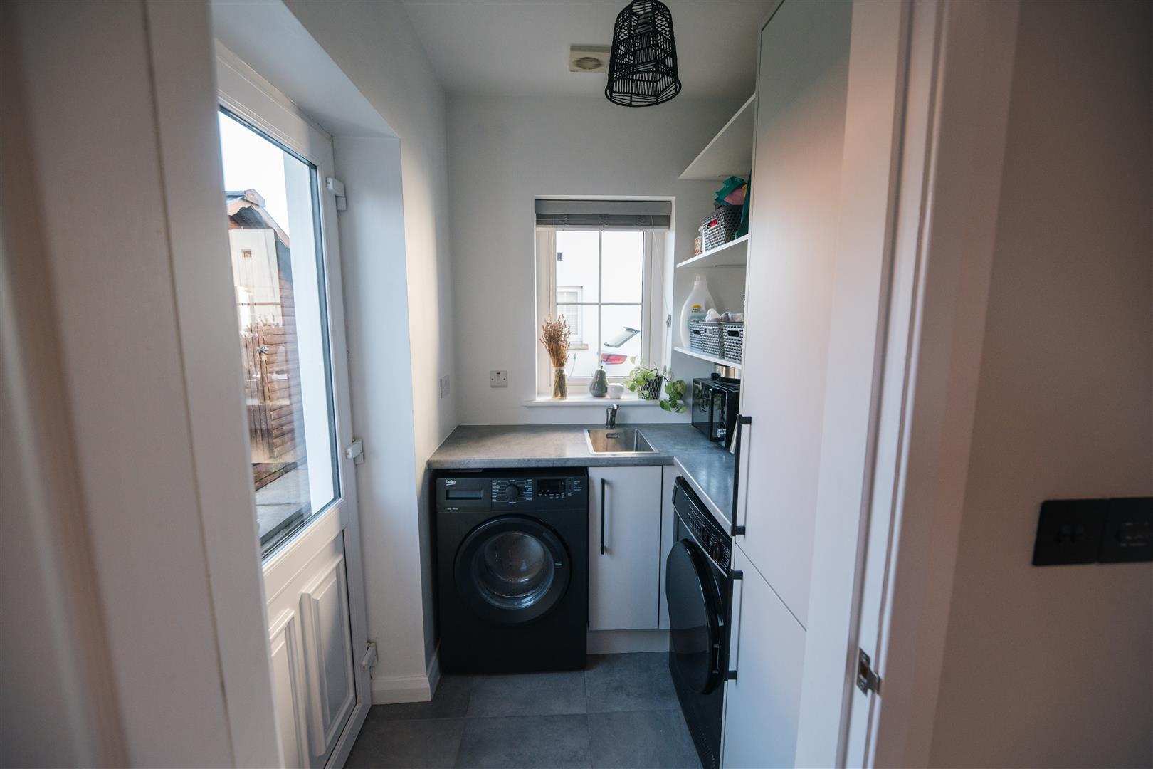 Plumbed space for washing machine and tumble dryer, fitted cupboards, sink unit, tiled floor and back door to rear.