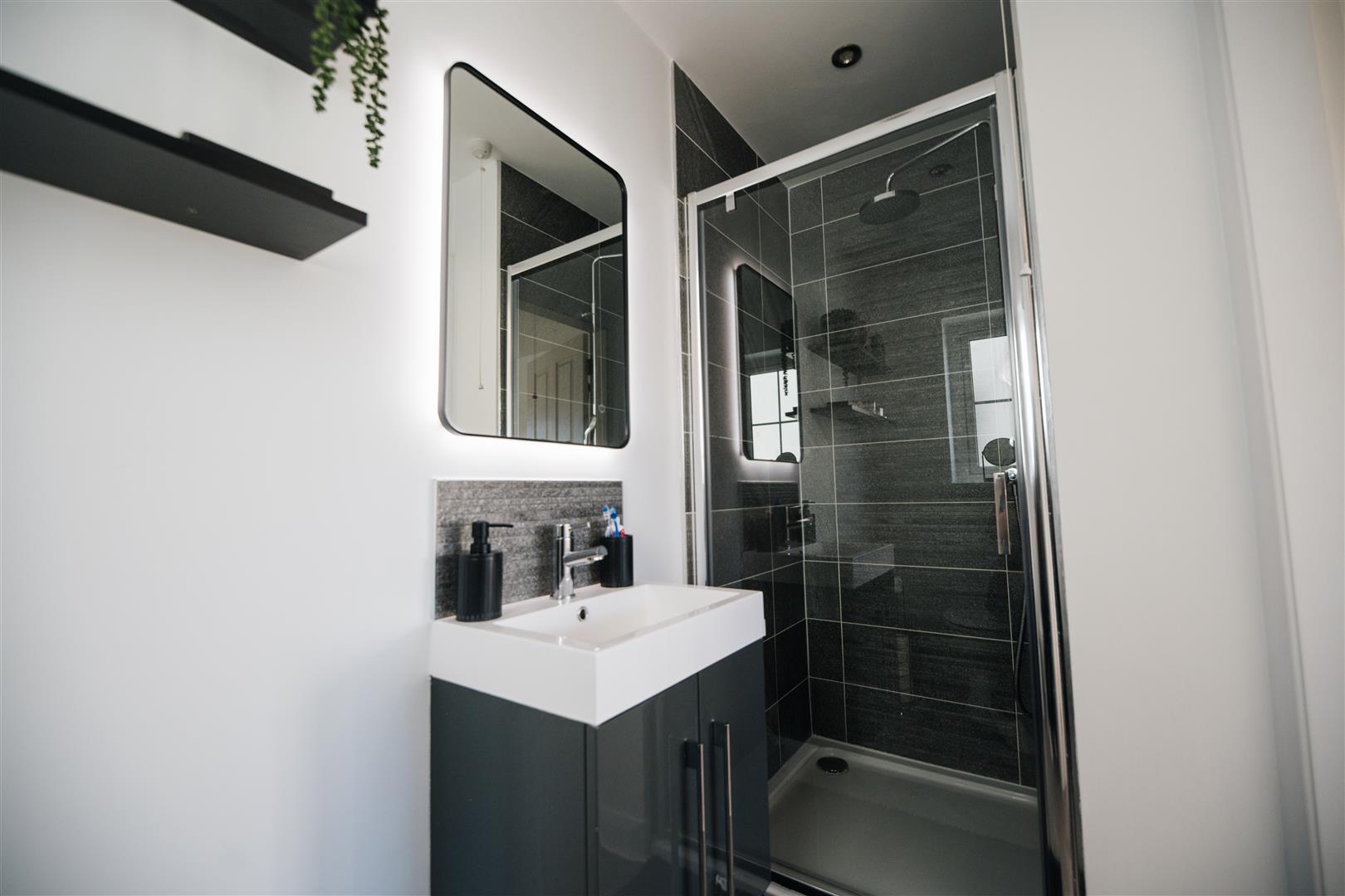 Walk in shower, wash hand basin with vanity unit, WC, heated towel rail, tiled floor, partially tiled walls and recessed lights.