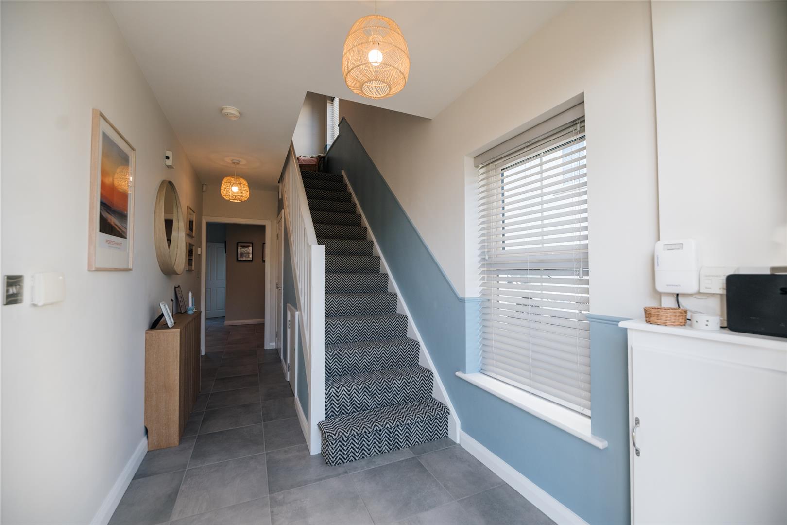 Spacious entrance hall accessed via composite front door with glazed side panels and arch, tiled flooring and built in storage under stairs
