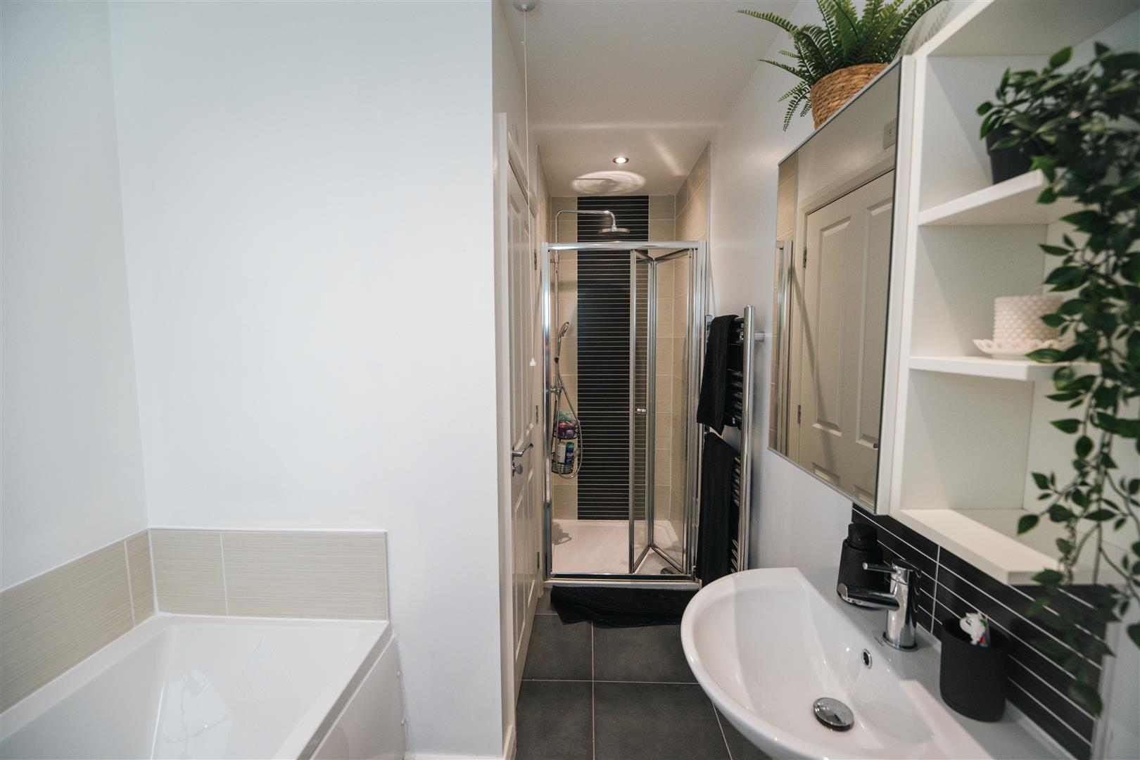 Modern suite comprising white panel bath, walk in shower with drencher head, wash hand basin and WC, heated towel rail, tiled floor, partially tiled walls and recessed lights.