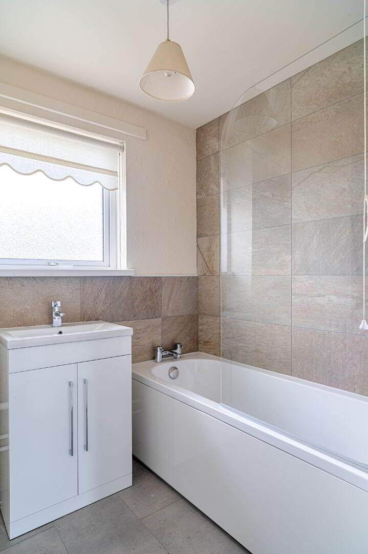 White suite comprising panel bath with electric shower above, vanity wash hand basin, partially tiled walls, tiled flooring.