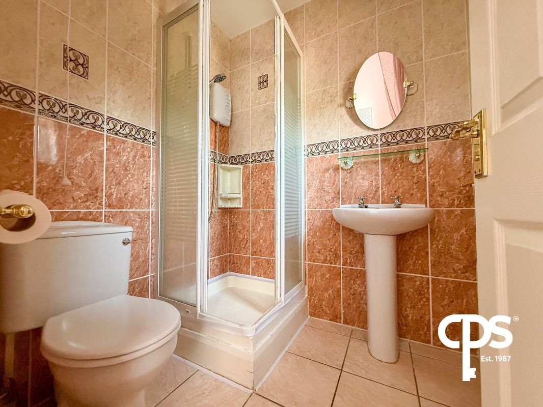 Fully tiled with a modern three-piece suite including WC, wash hand basin, and corner shower.