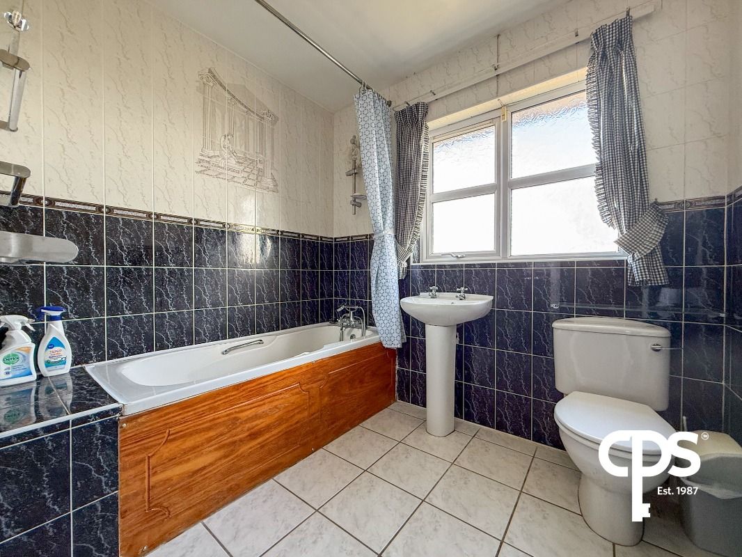 Fully tiled and finished with a three-piece suite comprising bath, wash hand basin, and WC.