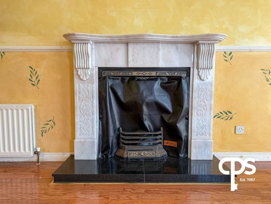 Measuring 3.68m x 5.85m, the bright and spacious living room features elegant wooden flooring and a charming bay window that floods the space with natural light. A striking marble centrepiece fireplace creates a warm and stylish focal point—perfect for relaxing or entertaining.