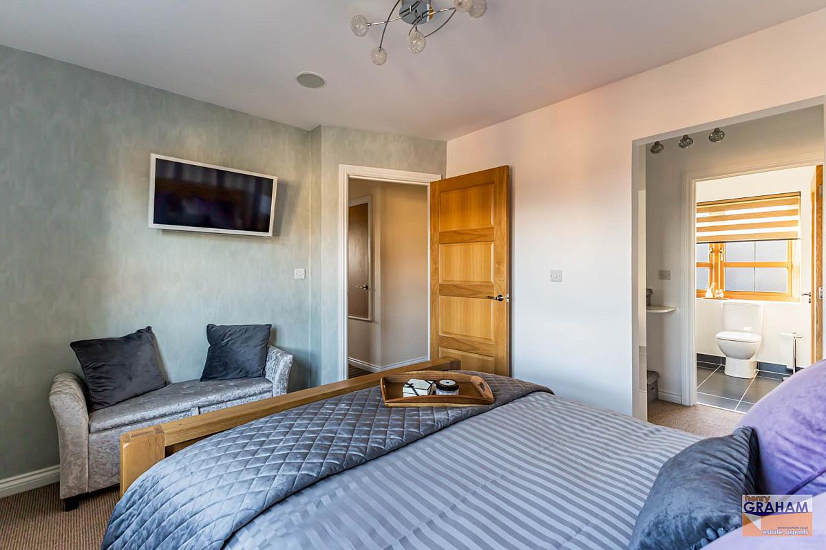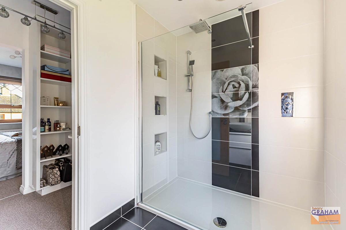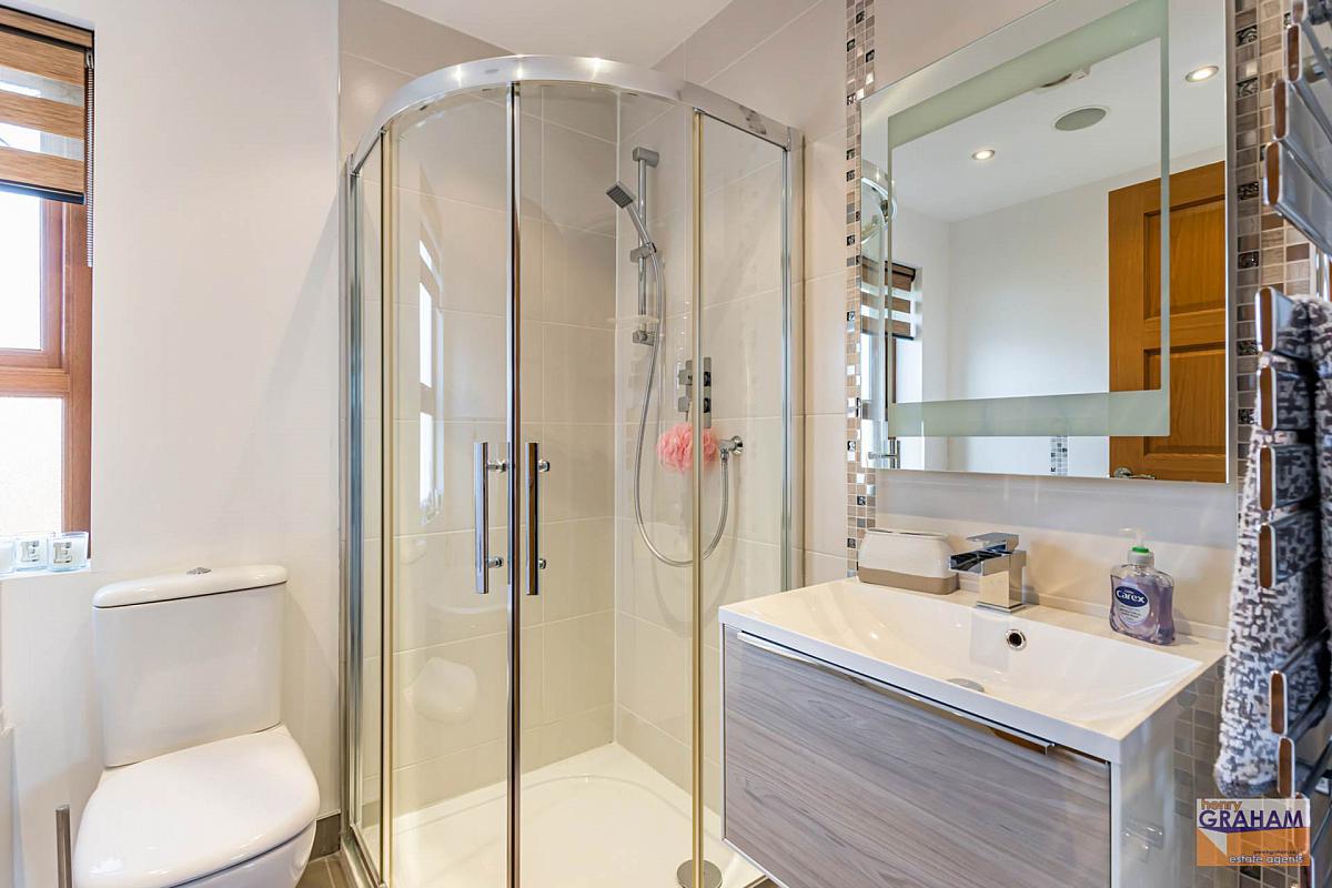White suite. Quadrant shower cubicle with thermostatic shower. Tile enclosed bath with centre mount waterfall style mixer tap. Wall mounted vanity unit with wash hand basin and waterfall style mono style mixer tap. Close couple low flush wc. Chrome finish heated towel rail. Part tiled walls. Tiled floor. Recessed spotlights. Two built in ceiling speakers. Built in television. Separate hotpress on landing.