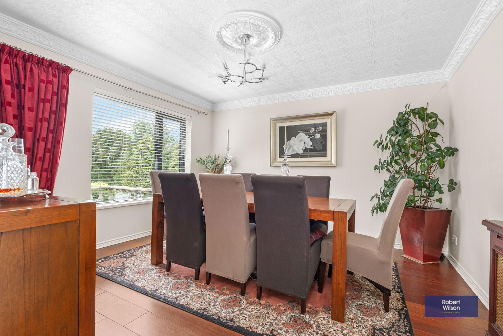 Ceiling cornice, ceiling rose and solid mahogany strip wood flooring.