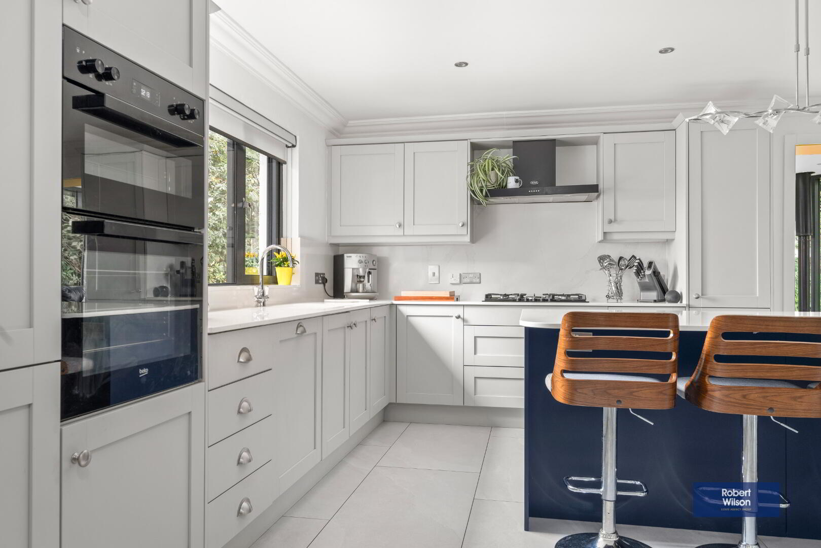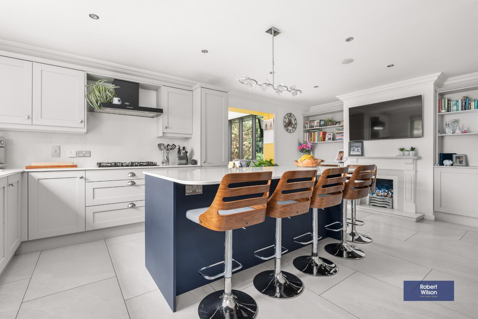 Recently installed bespoke fitted grey shaker style kitchen with quartz work tops. Integrated fridge freezer, wine rack, integrated eye level double oven, 1 1/2 "Bold Blanco" composite sink, 5 ring "Neff" gas hob with fixed canopy extractor fan over. Centre island with ample storage and overhang for entertainment, feature gas fire, feature built in storage and shelving, ceiling cornice, recessed lighting and tiled flooring.