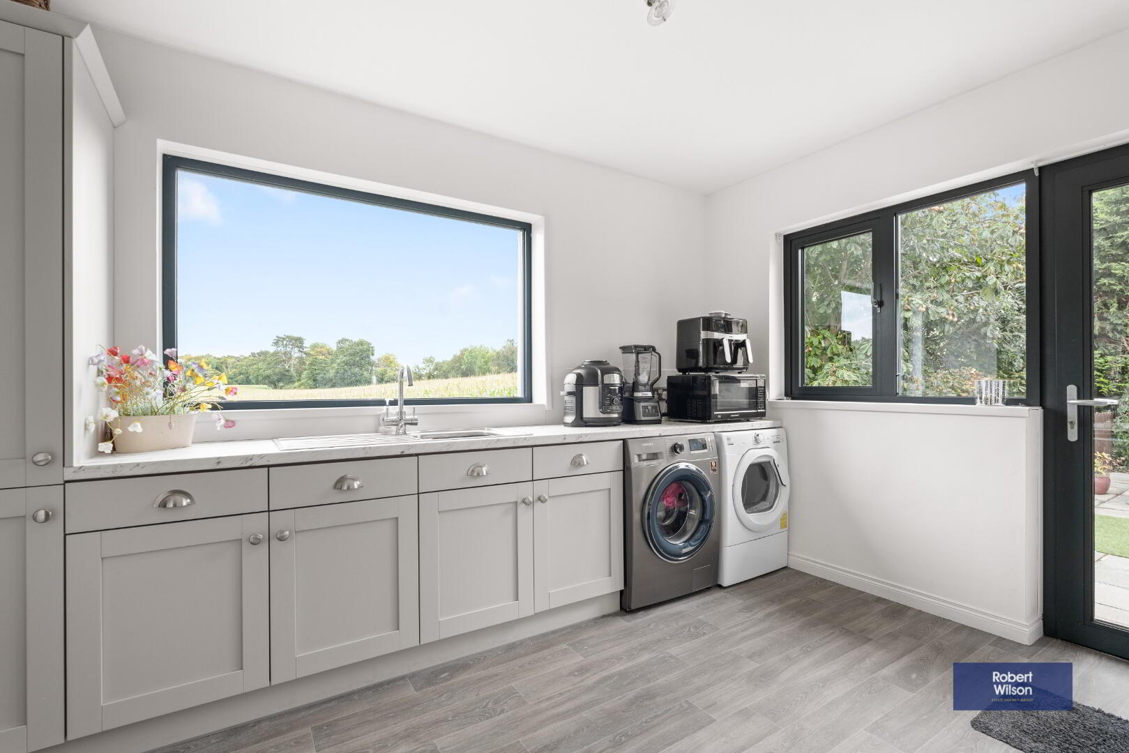 Range of high and low level units to match kitchen, stainless steel sink unit, room for plumbed automatic washing machine and tumble dryer, large storage cupboard and door to rear.