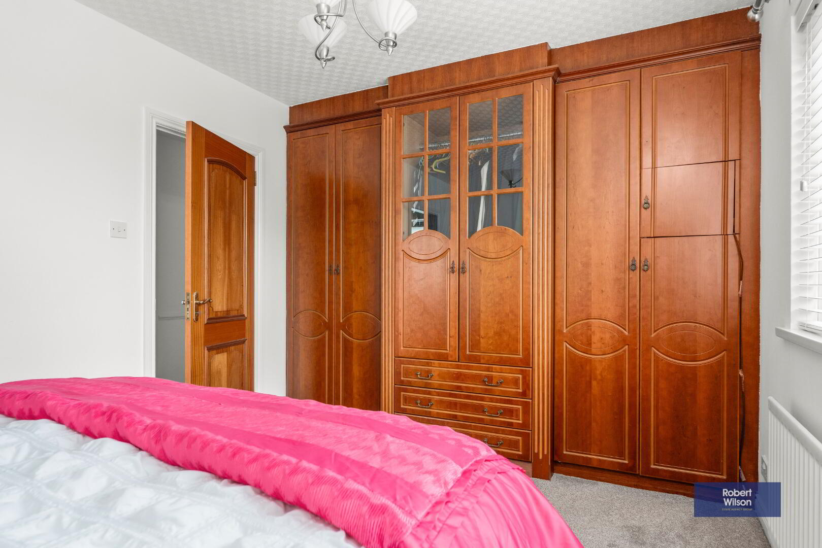 Range of built in wardrobes and single panel radiator.