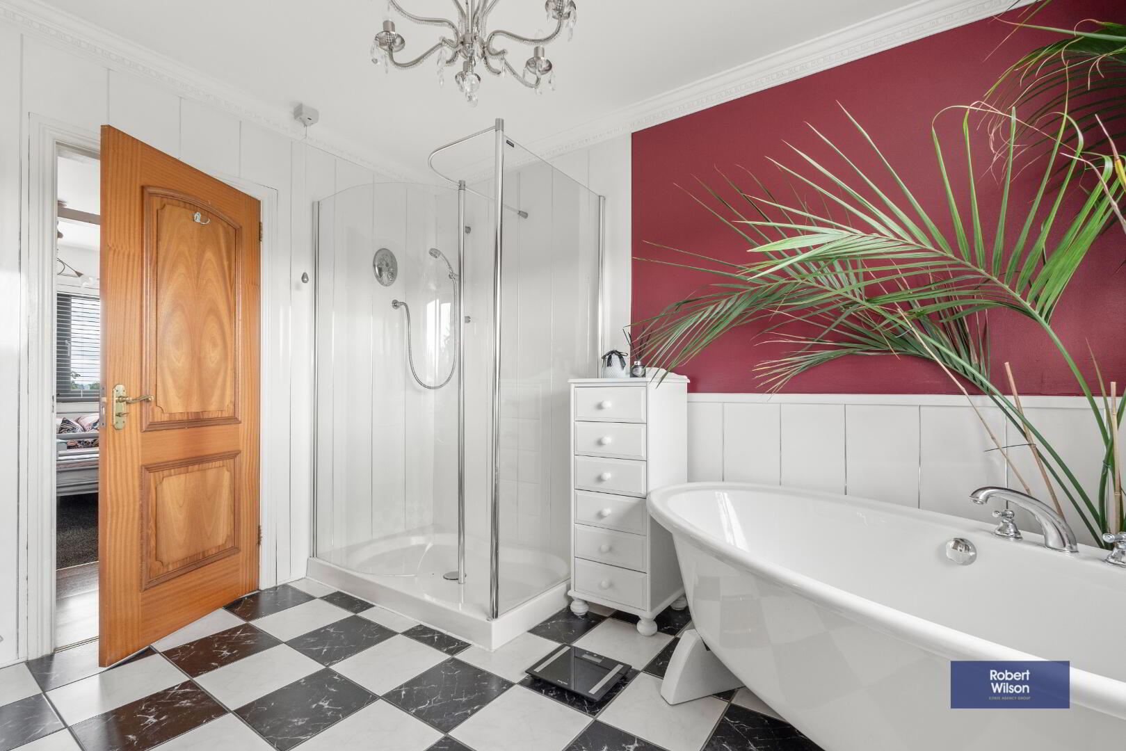 Luxury 4 piece white suite comprising, free standing roll top bath tub, low flush WC, wash hand basin incorporated into mounted vanity unit, large walk in shower cubicle with Triton power shower, wall mounted heated towel rail, tiled flooring, ceiling cornice and ceiling rose.