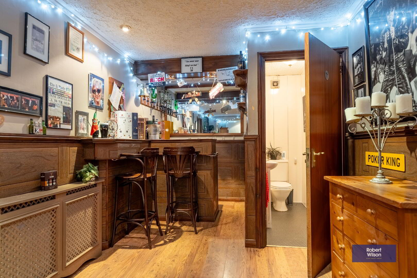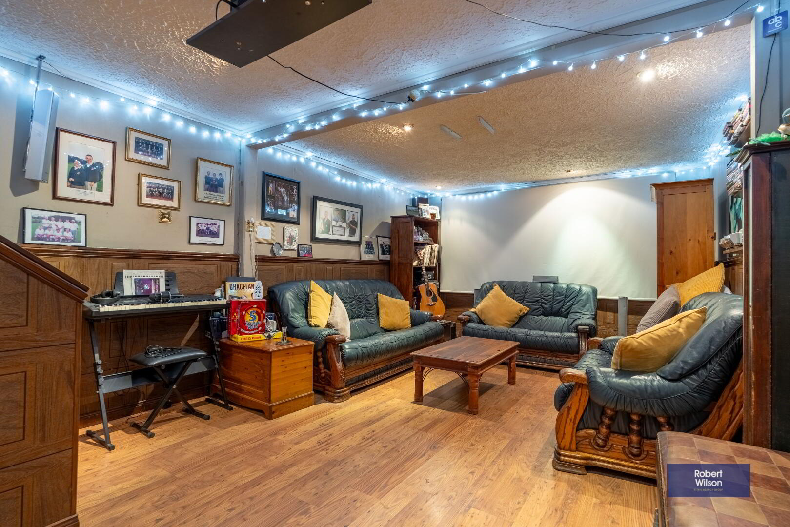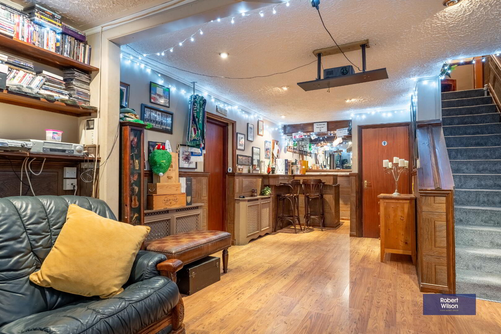 Fully fitted bar with space for under counter fridge, wiring for projector screen, wood laminate flooring and half panelled walls.