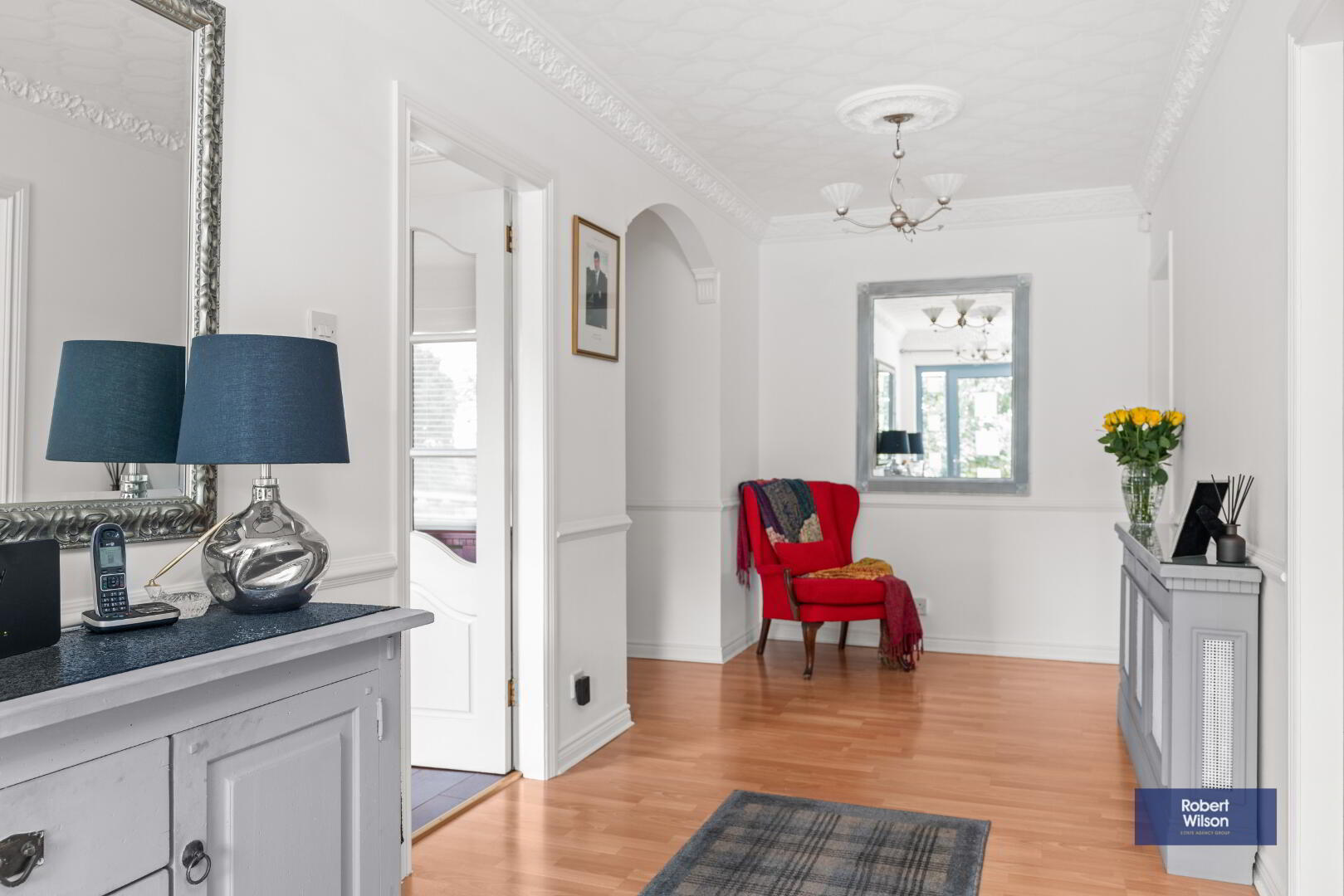 Front door with glazed centre piece. Ceiling cornice, centre rose and wood laminate flooring.