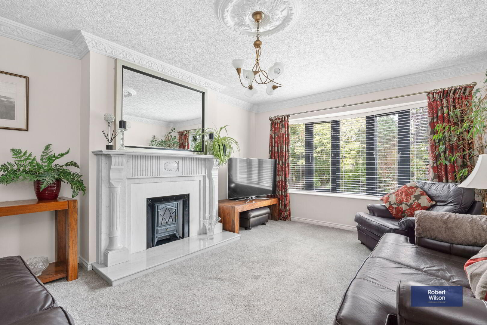 Feature fire place with white marble inset surround and hearth, ceiling cornice, centre rose and feature bow window.
