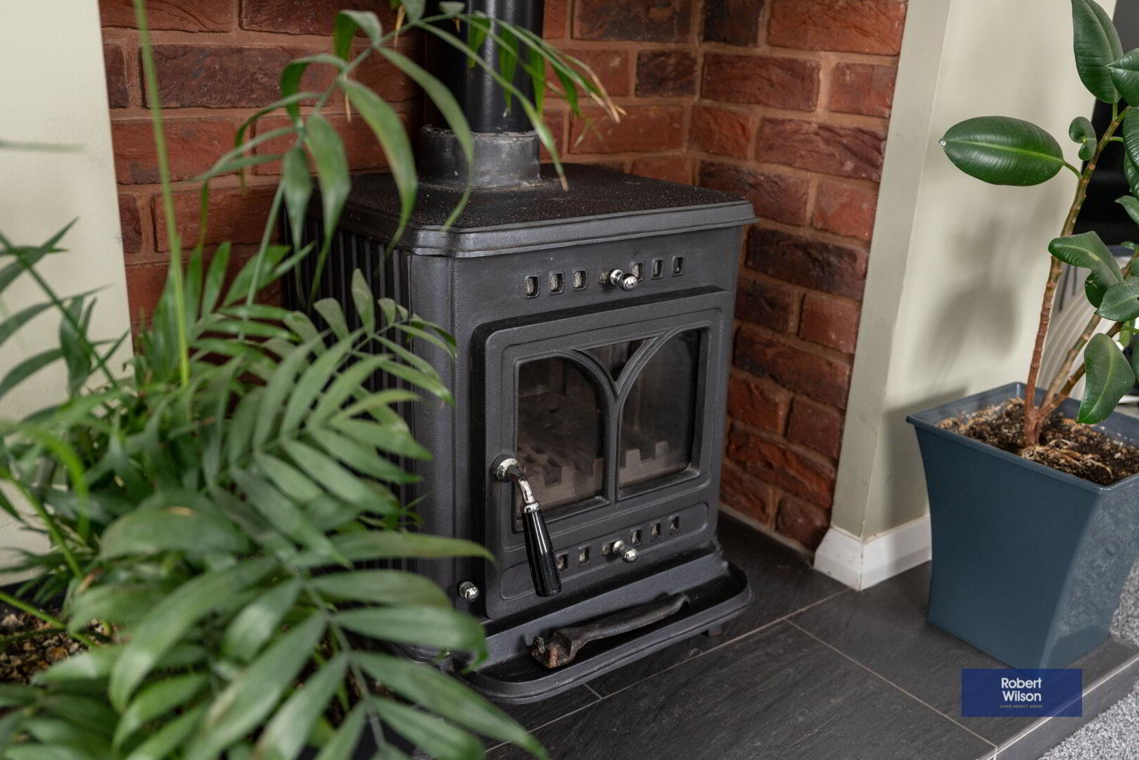 Bright and spacious living room with multi-fuel stove