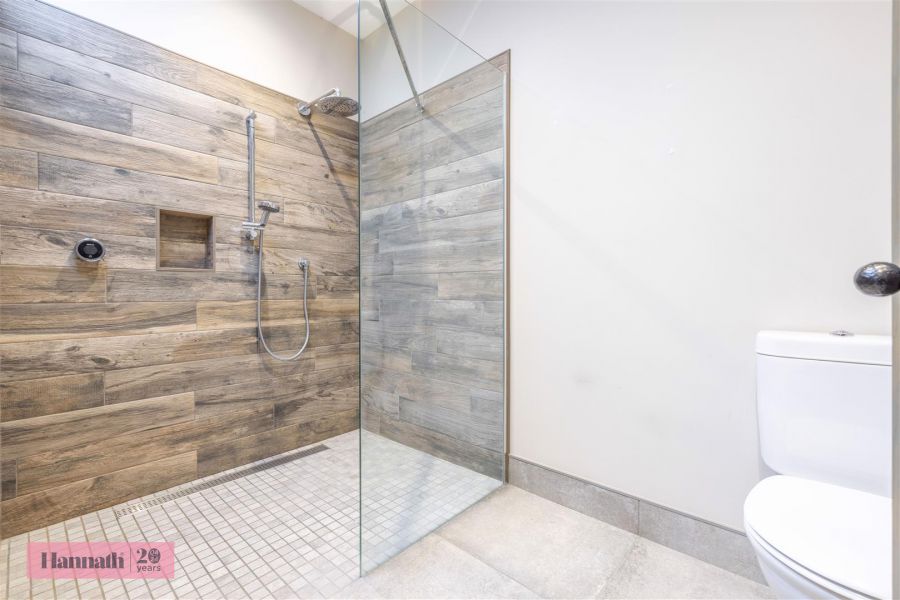 Tiled flooring, wash hand basin, storage unit, w.c., walk in mains shower unit, tiled surround.