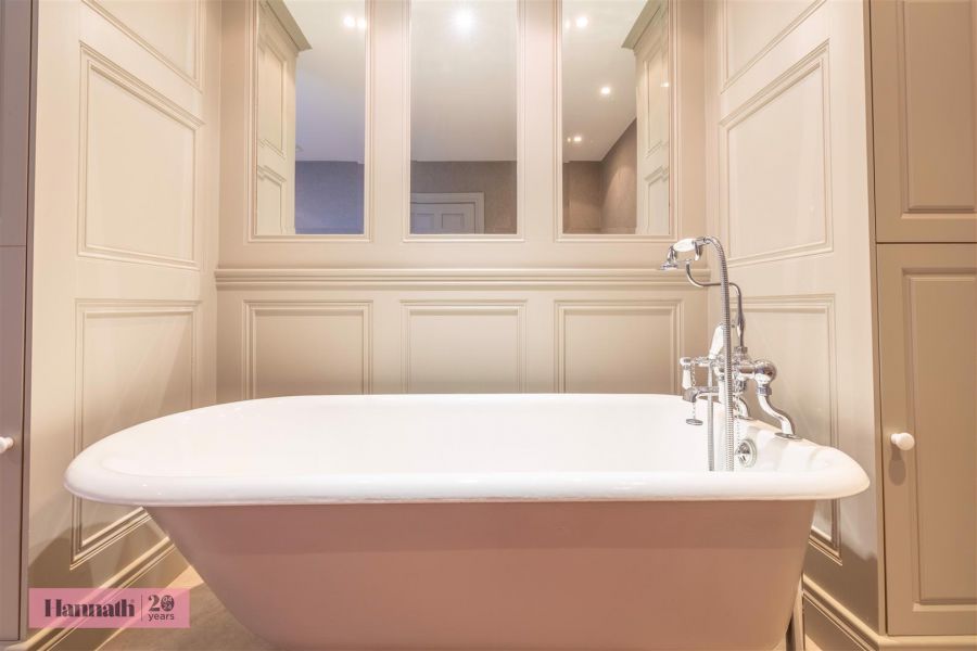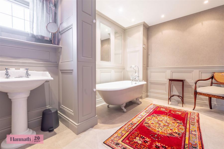 3 piece suite, stand alone bath, wash hand basin, w.c., tiled flooring, double panel radiator, half panelled walls