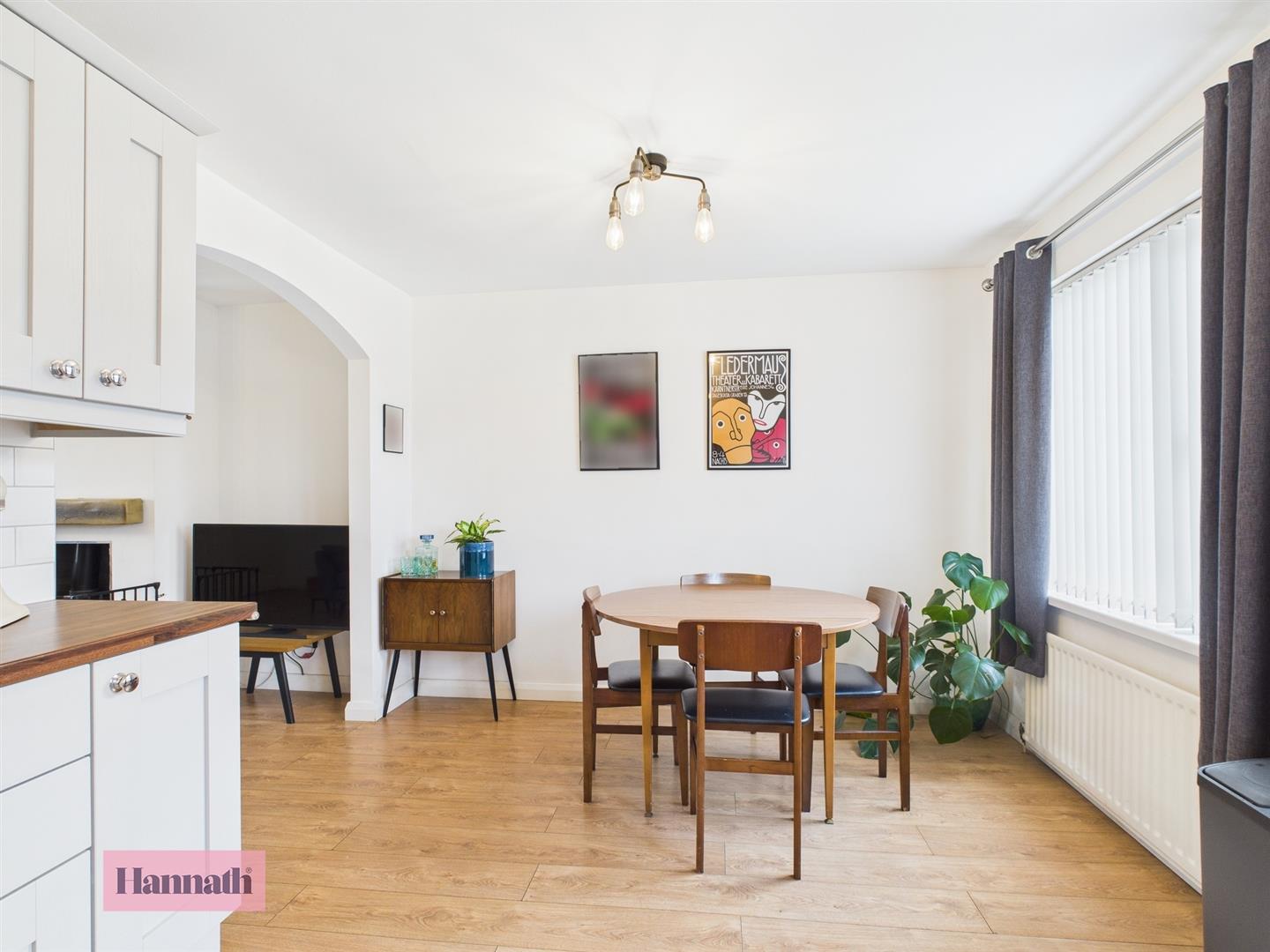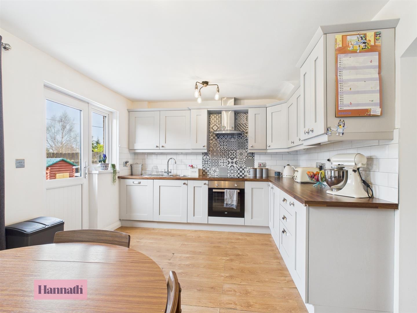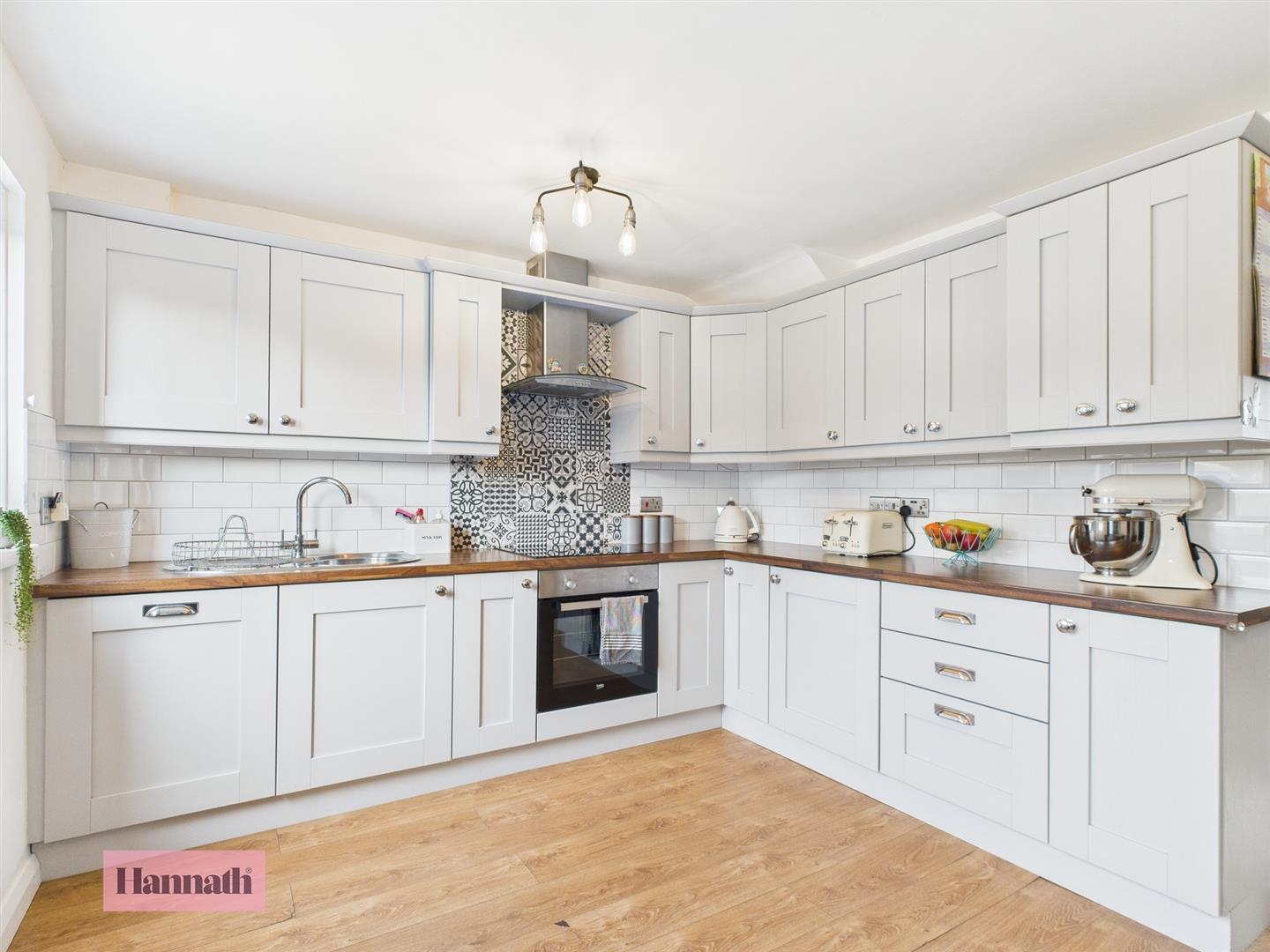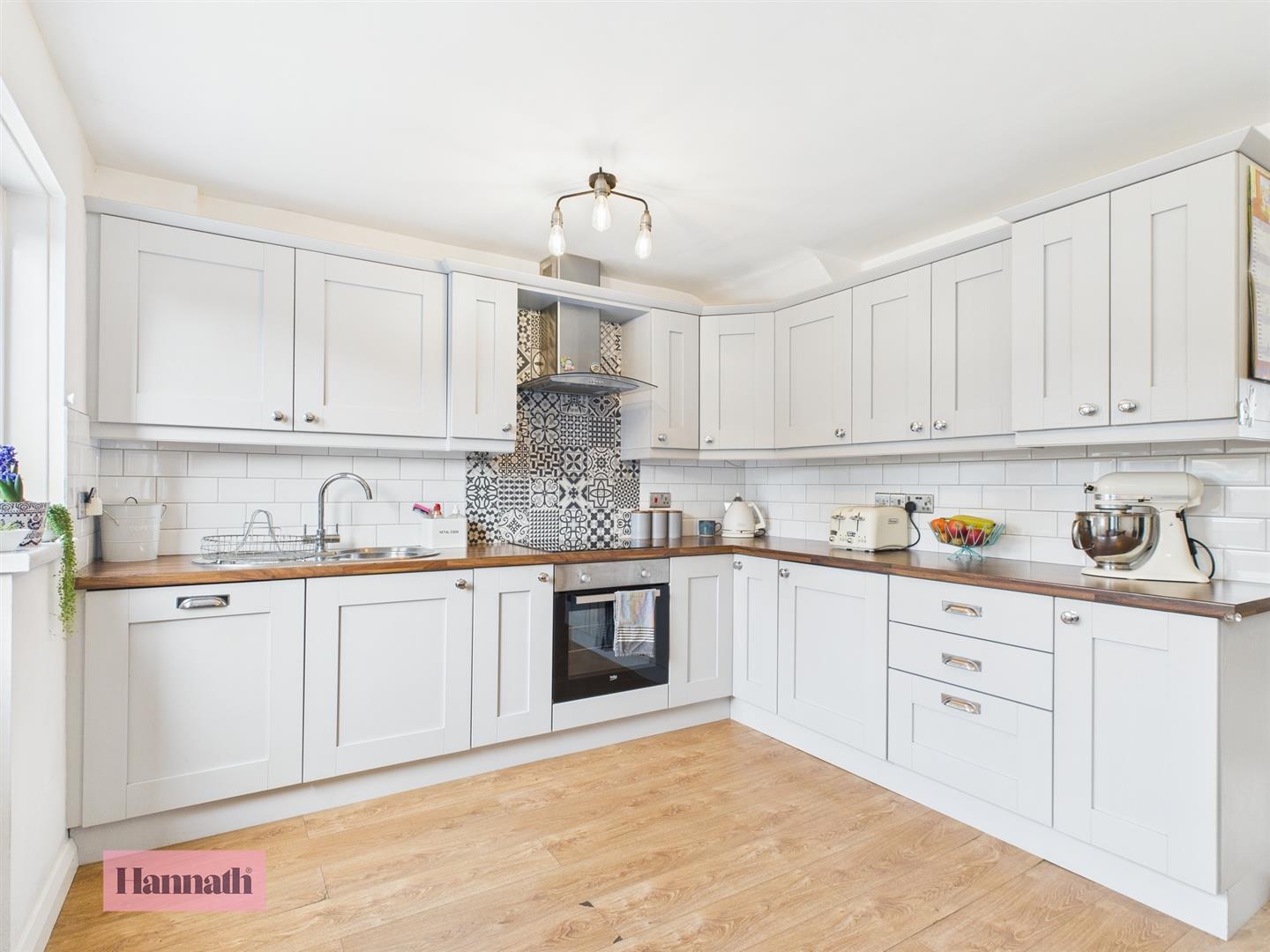 Range of high and low level units, integrated units, wood laminate flooring, single panel radiator, back door to rear, part tiled walls.