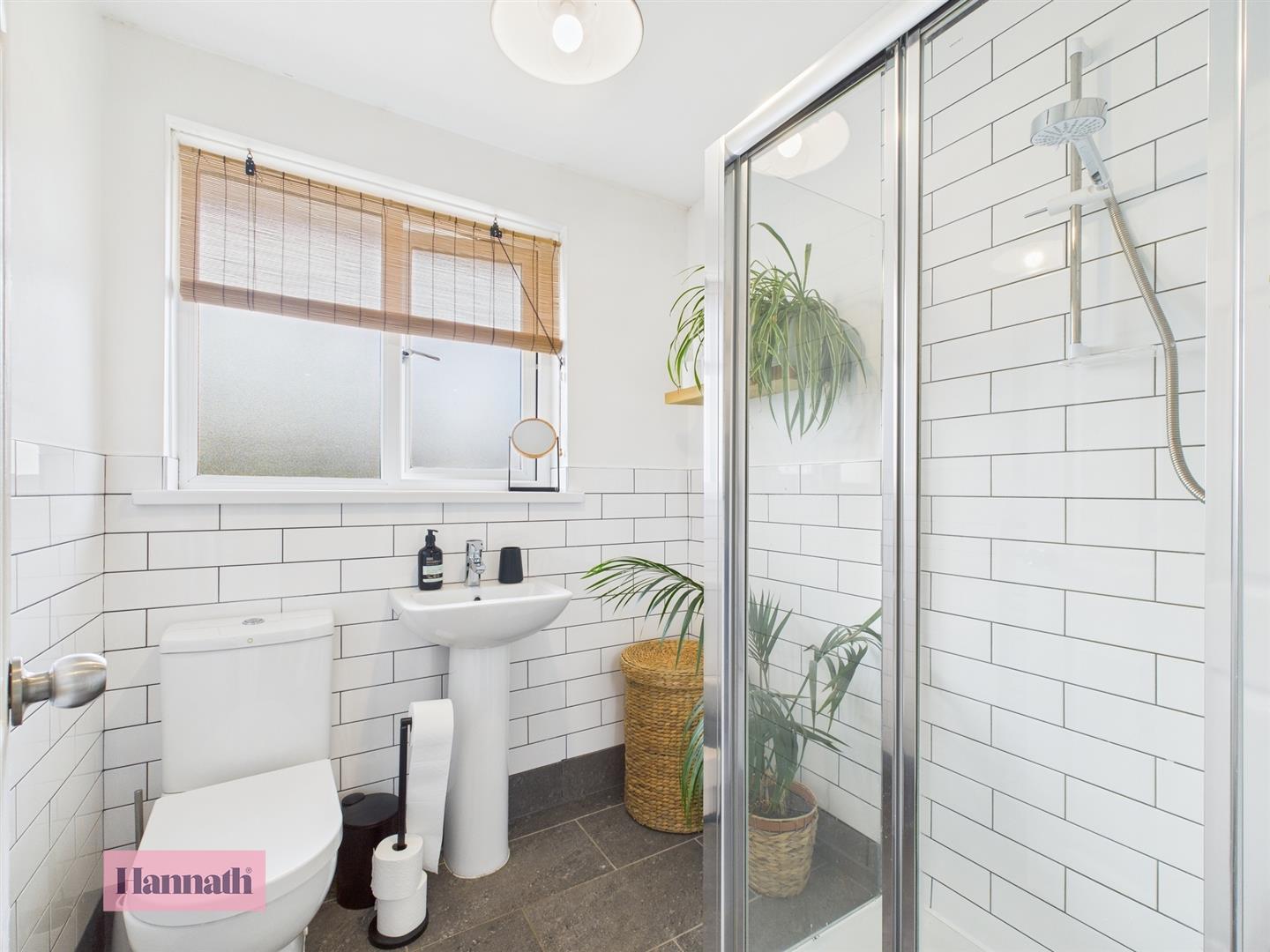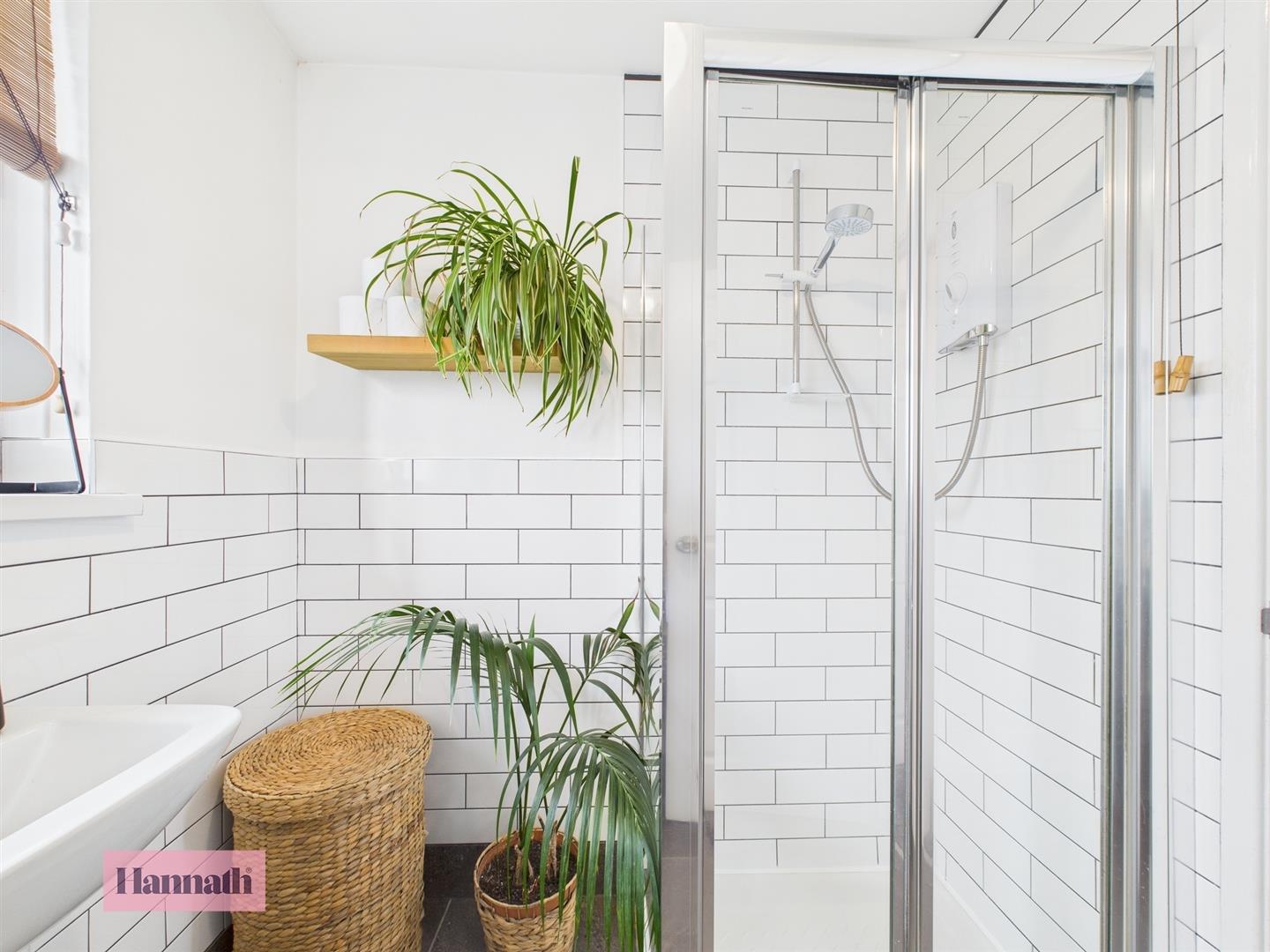 Three piece suite comprising electric shower cubicle, wash hand basin and w.c., part tiled walls, tiled flooring, heated towel rail