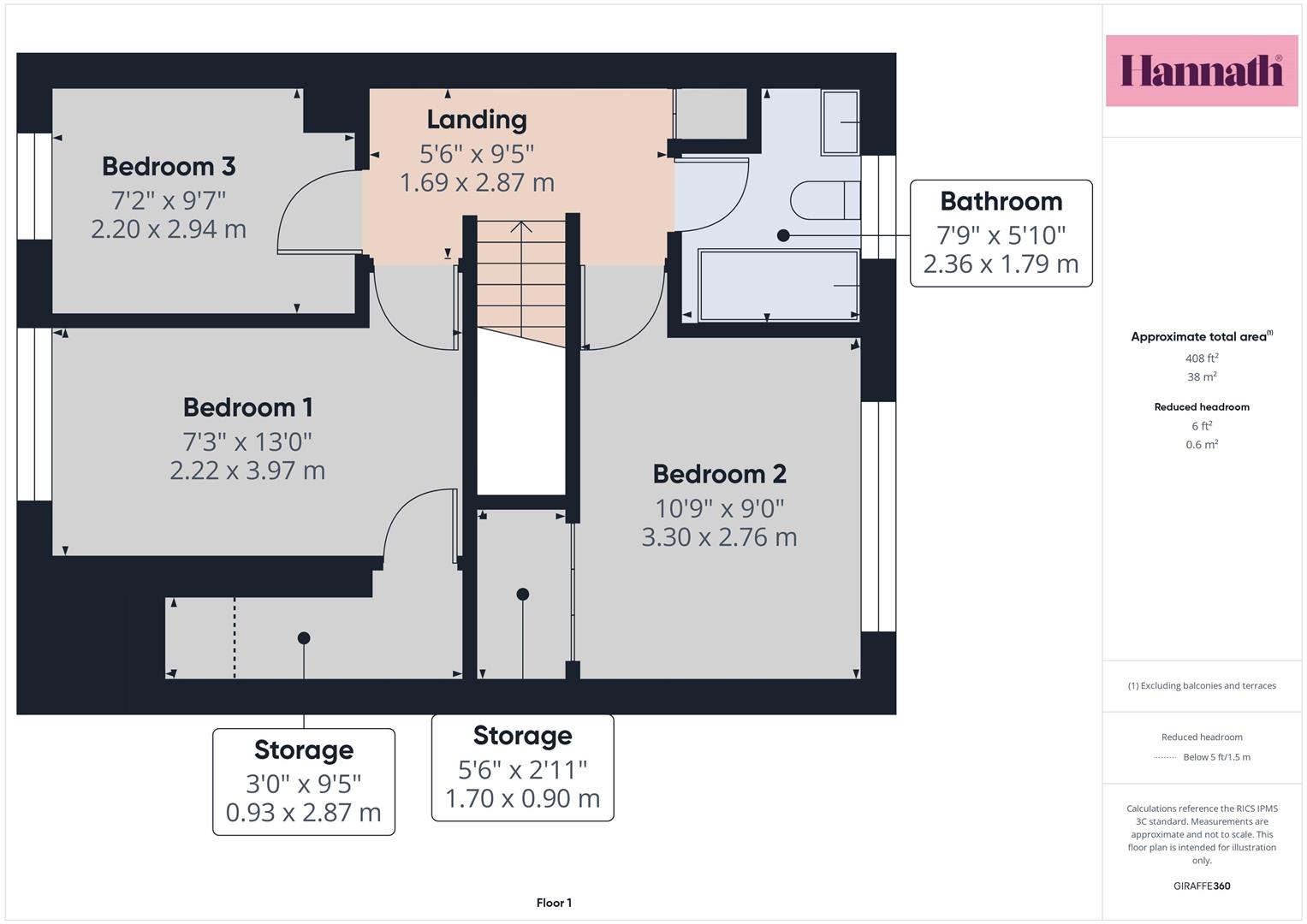 Landing 5'6" X 9'5" (1.68m X 2.87m)