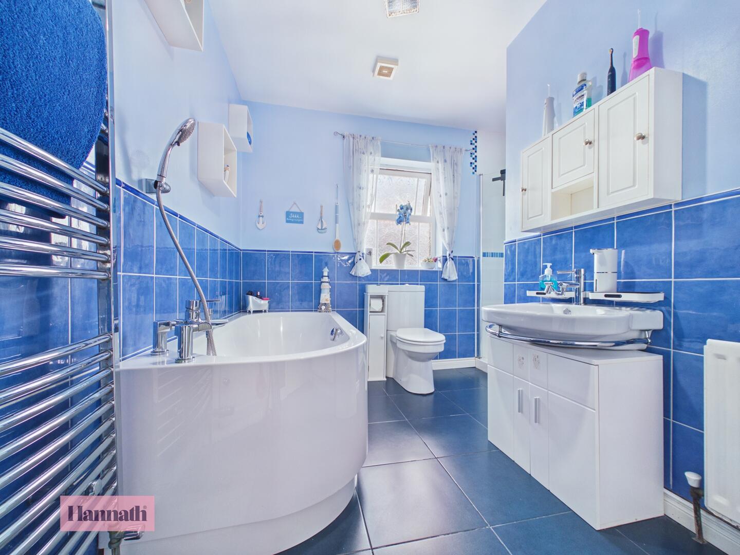The bathroom features a mix of blue tiles halfway up the walls and on the floor, paired with pale blue painted walls above. It includes a rolled-edge bathtub, a white vanity unit with basin, a toilet & separate shower. The room benefits from a window that allows natural light to brighten the space and a heated towel rail for added comfort.