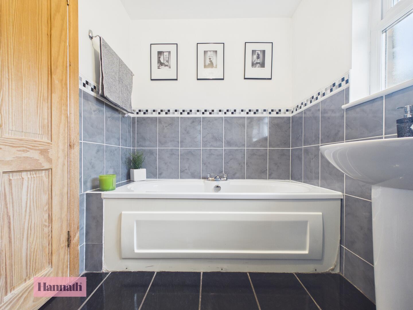 The family bathroom is tiled in dark grey and white, featuring a bath, separate corner shower cubicle, pedestal basin, and WC. The room is brightened by a window and finished with modern fittings for comfort and style.
