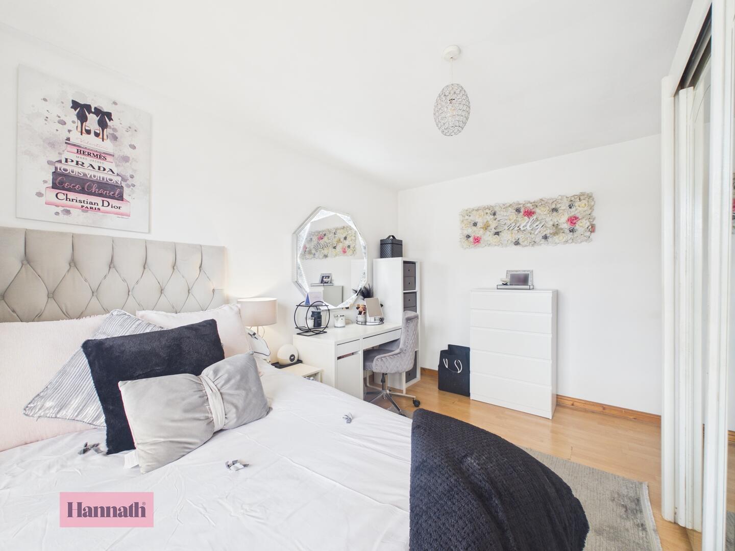 Bedroom 1 is a generous double room with wood flooring, a large window for natural light, and a walk-in wardrobe providing ample storage. It benefits from a modern en-suite shower room, adding privacy and convenience.