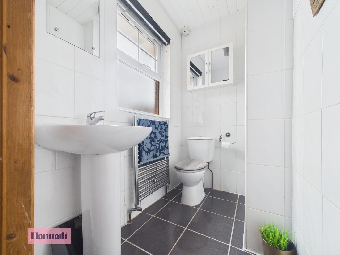 This downstairs w.c. is neatly finished with tiled flooring and white fixtures, including a WC and pedestal basin.