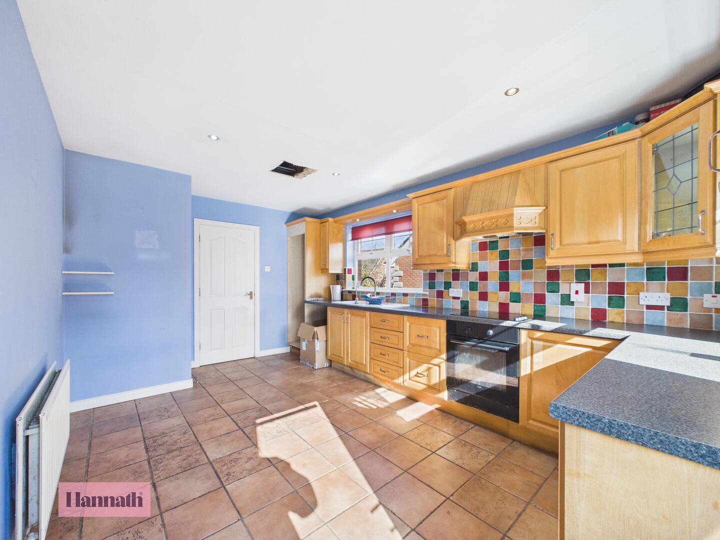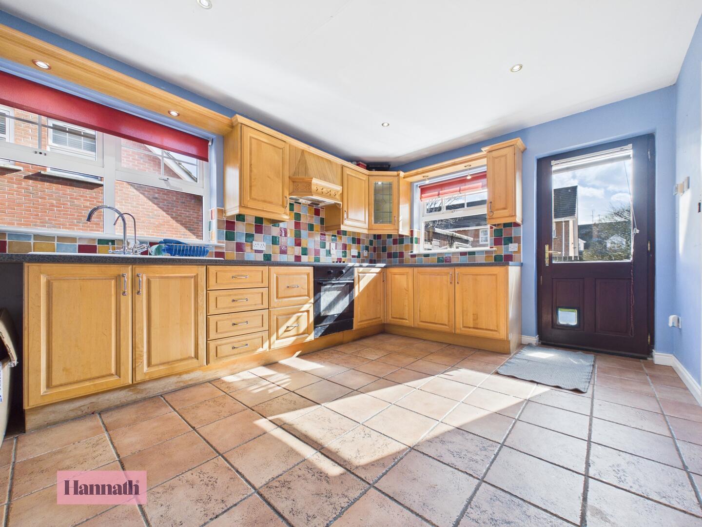The kitchen is generously proportioned with tiled flooring and a range of wooden wall and base units. A colourful tiled splashback adds character, while large windows fill the room with natural light. There is a built-in oven with a hob and an external door offering access to the rear garden, making it practical for entertaining.