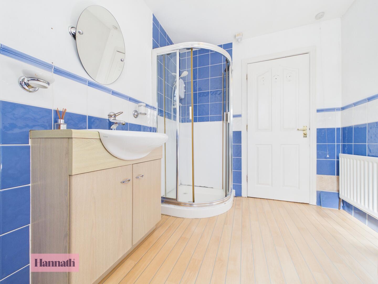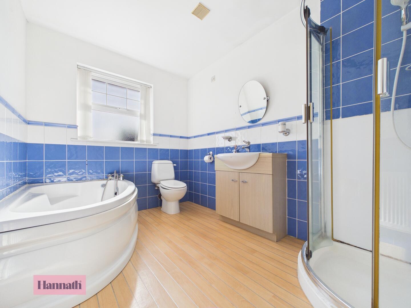 The bathroom is spacious and features a corner bath, a separate walk-in shower, a toilet, and a vanity unit with a basin. The room is tiled partly in blue and has wood effect flooring, with a window ensuring natural light and ventilation.