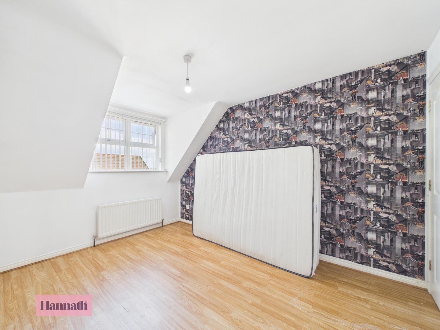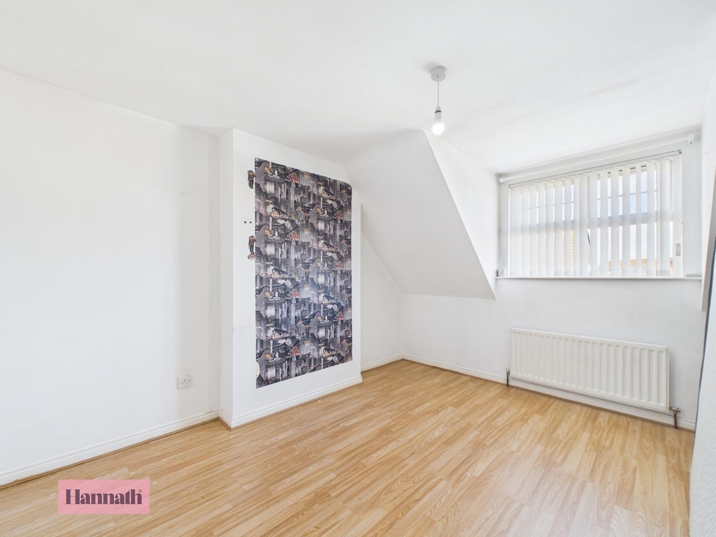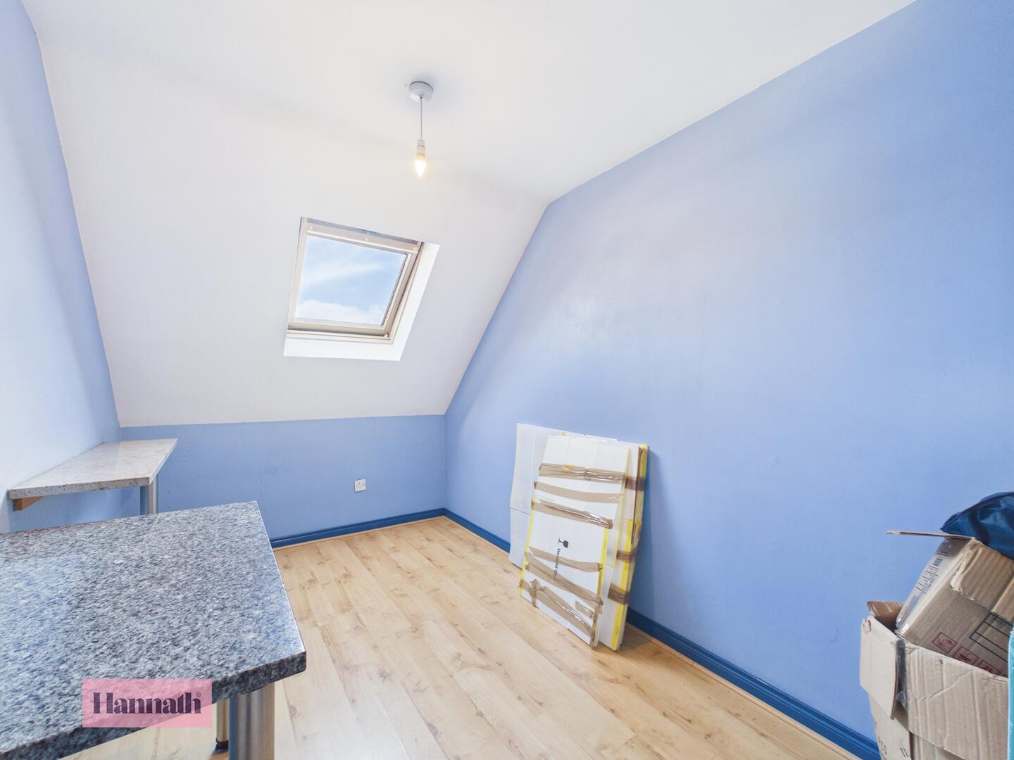 Bedroom 3 is a smaller bedroom with wood effect flooring and a roof window that floods the space with natural light. The sloped ceiling adds character, while the neutral decor provides a blank canvas to personalise the room.