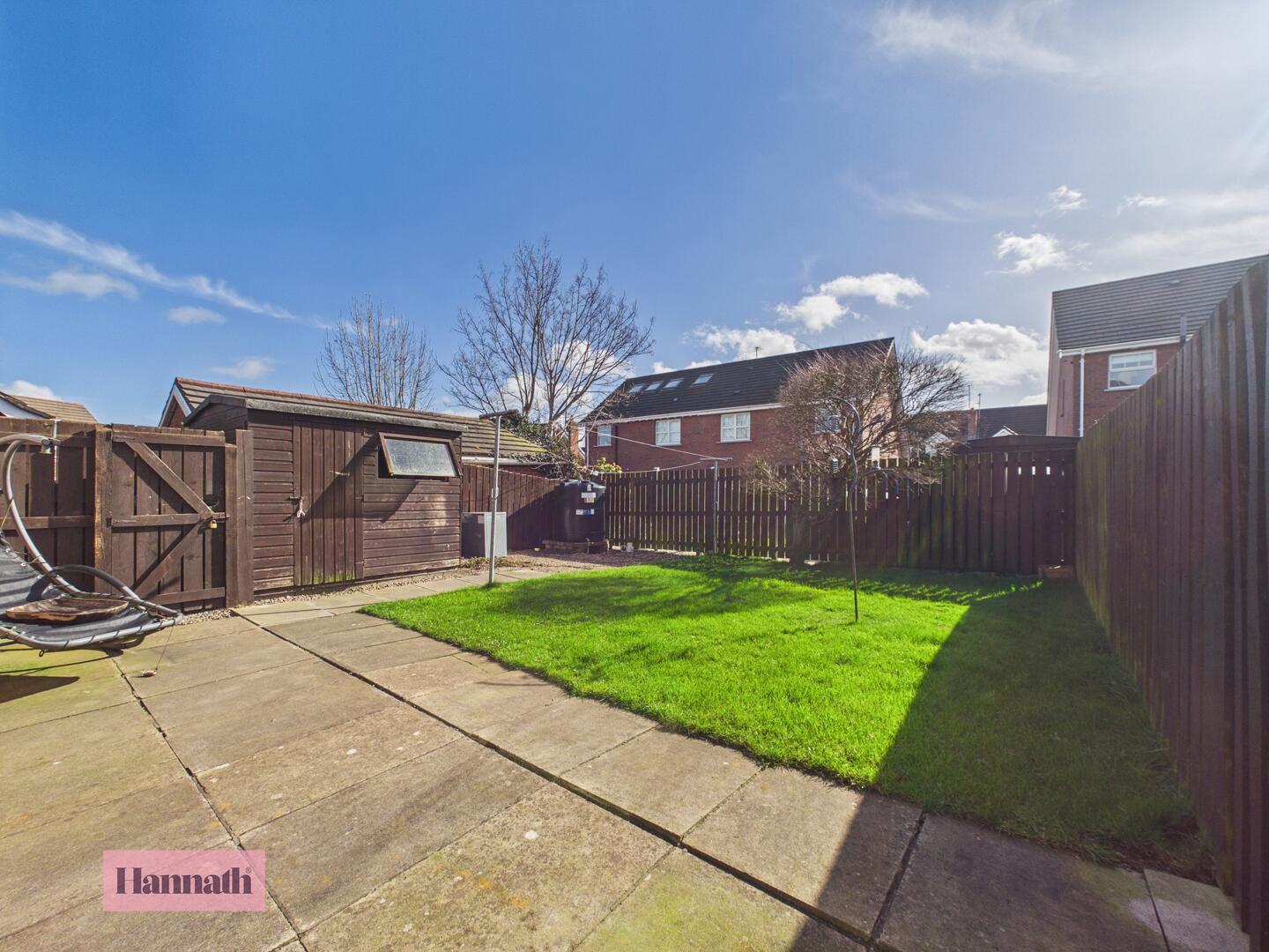 The rear garden is a well-maintained outdoor space with a lawn bordered by fencing. There is a paved patio area ideal for seating or outdoor dining, along with a garden shed providing useful storage. The garden is private and well enclosed, offering a peaceful place to relax or entertain.