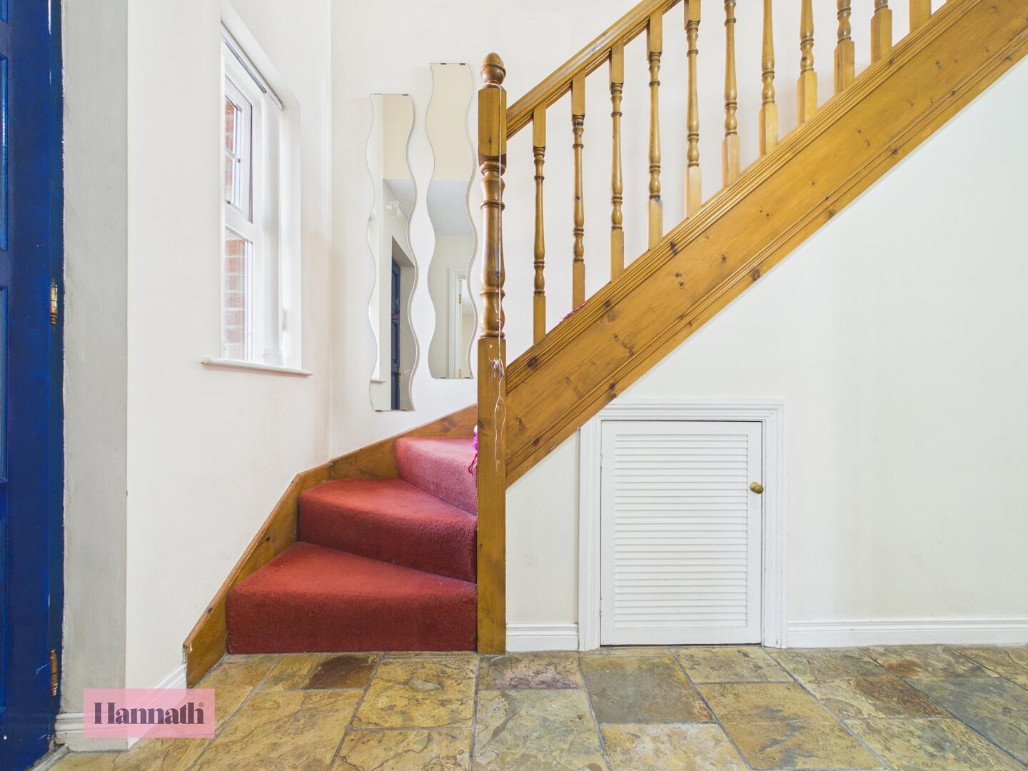 The hallway is bright and inviting, featuring natural stone flooring that adds a rustic touch. A wooden staircase with a polished bannister ascends to the upper floor, and a window allows natural light to filter through, enhancing the airy feel of the space.