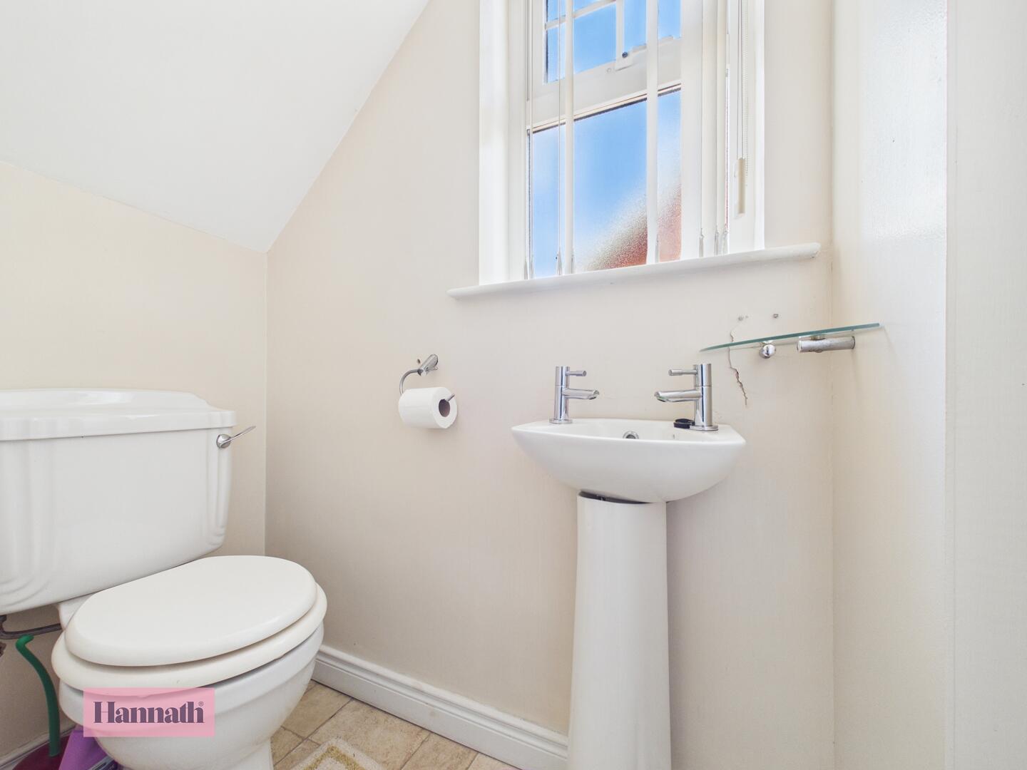 The ground floor benefits from a convenient WC, fitted with a toilet and a pedestal basin. A small window provides natural light, maintaining a fresh atmosphere in this practical space.